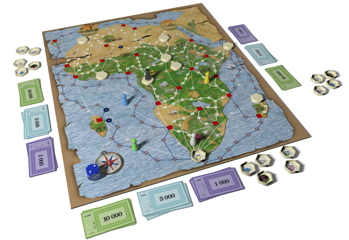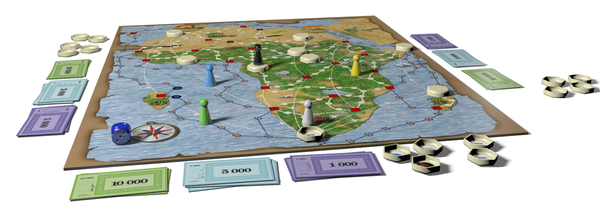 • Brädspel där du reser på land, till sjöss eller med flyg – men se upp för rövare.