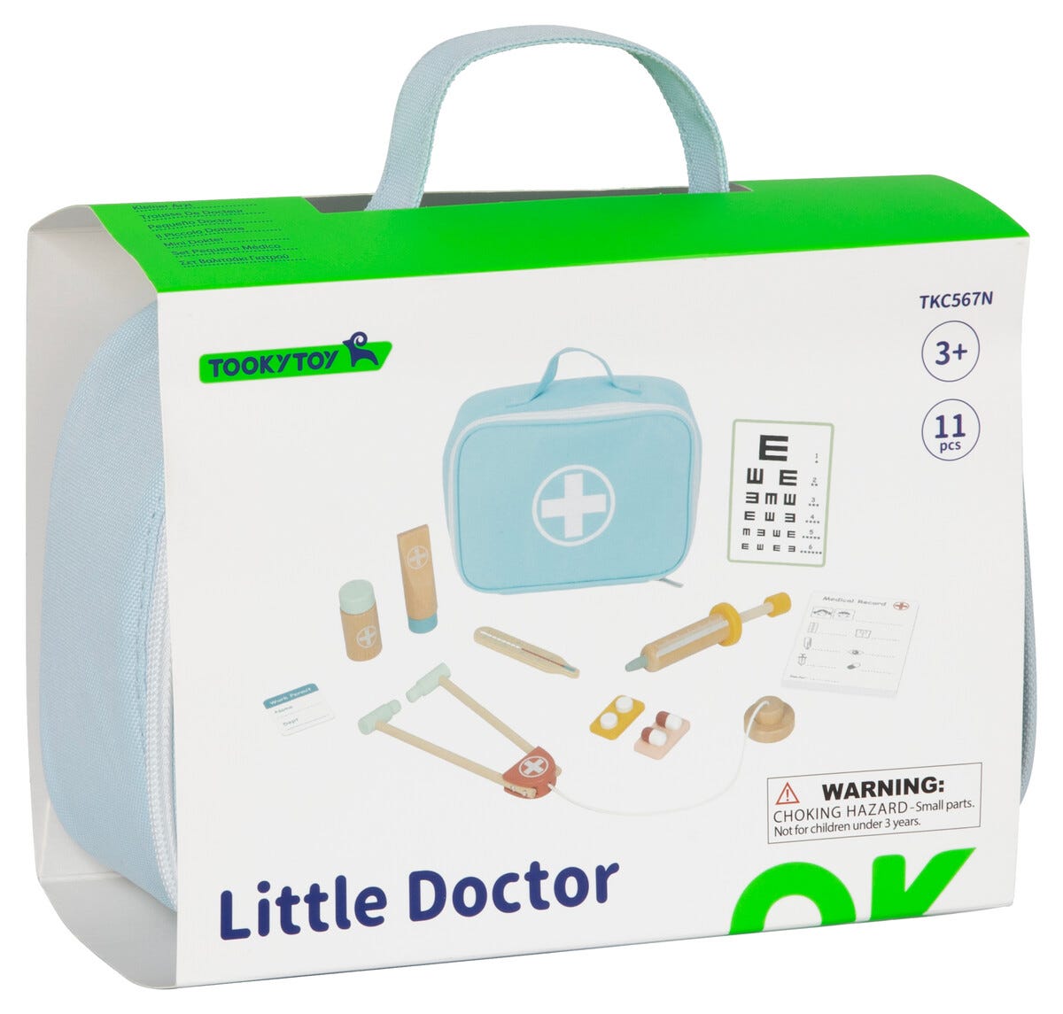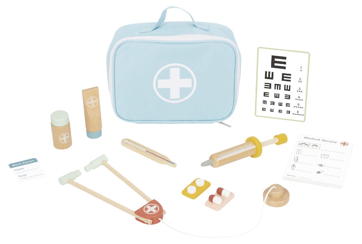 • Doktorsväska med läkarutrustning i trä – stetoskop, termometer, salva, piller m.m.