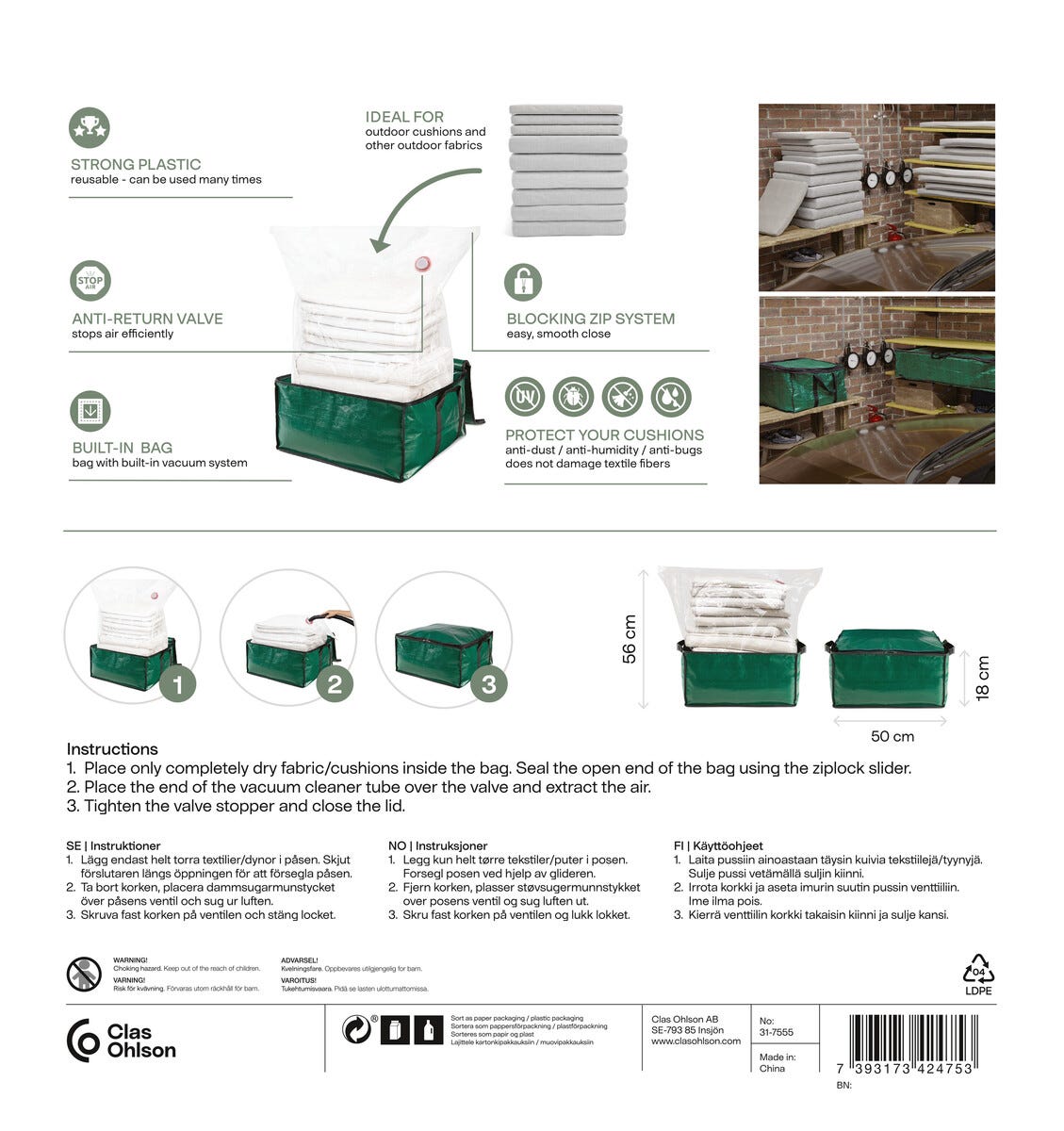 • Lättanvänd vakuumpåse för förvaring av dynor – sug ur luften med en dammsugare.