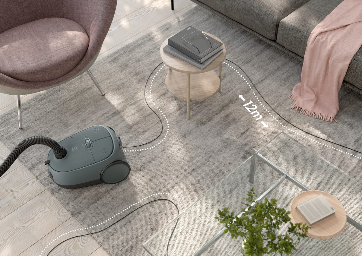 • Dammsugare med 12 m räckvidd – når långt från ett och samma uttag.