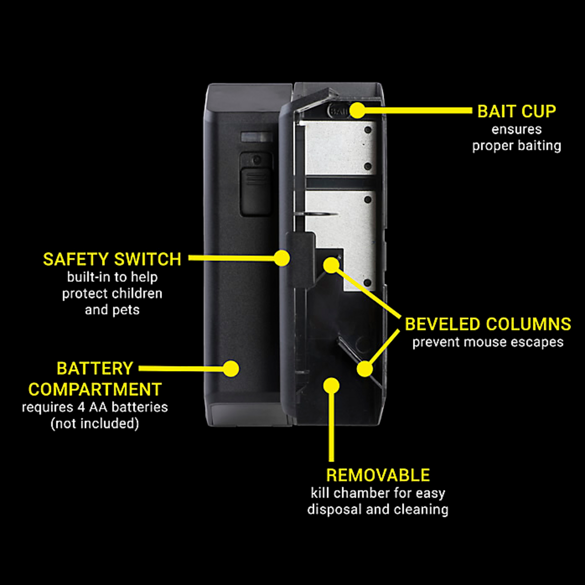 • Dödar upp till 100 gnagare på en enda uppsättning batterier, fångar 1 mus i taget.