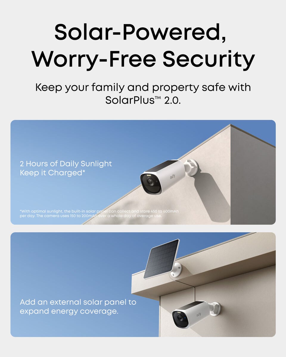 • EufyCam E40 2-Cam Kit med solpanel – laddas via solljus eller USB.