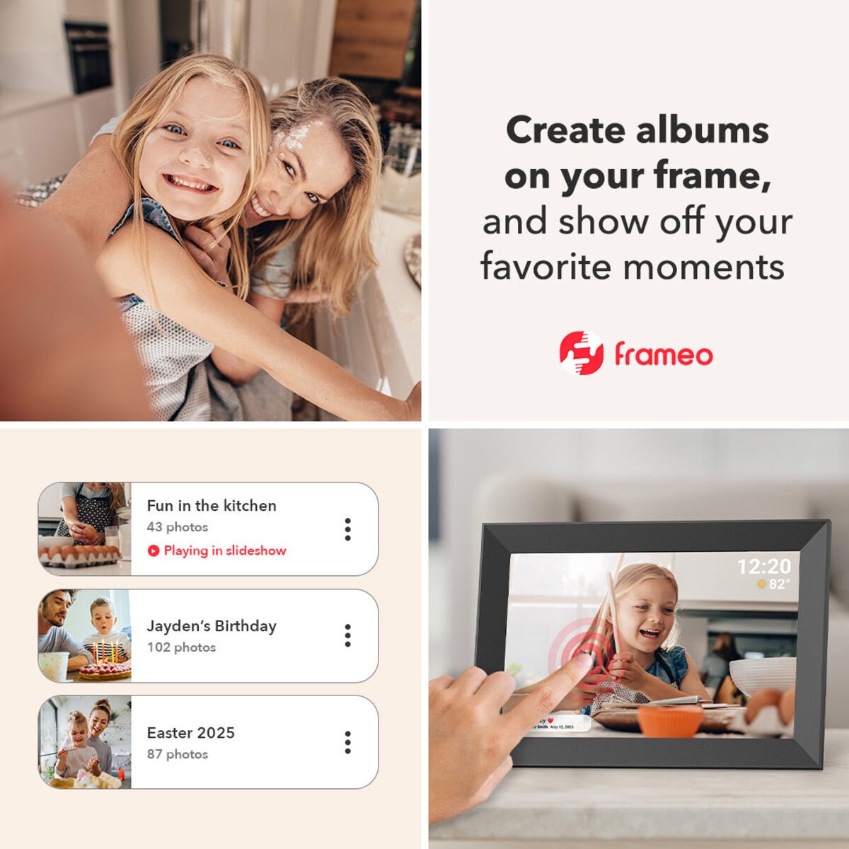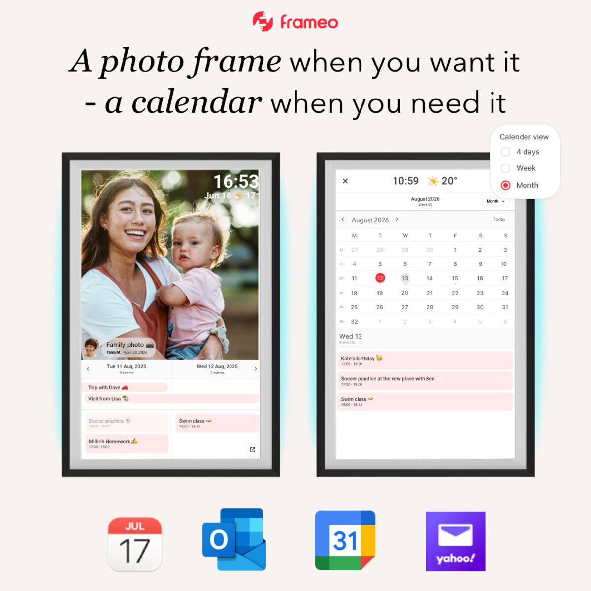 • Exibel digital fotoram med WiFi och kalenderfunktion – dela bilder från mobilen via appen Frameo.