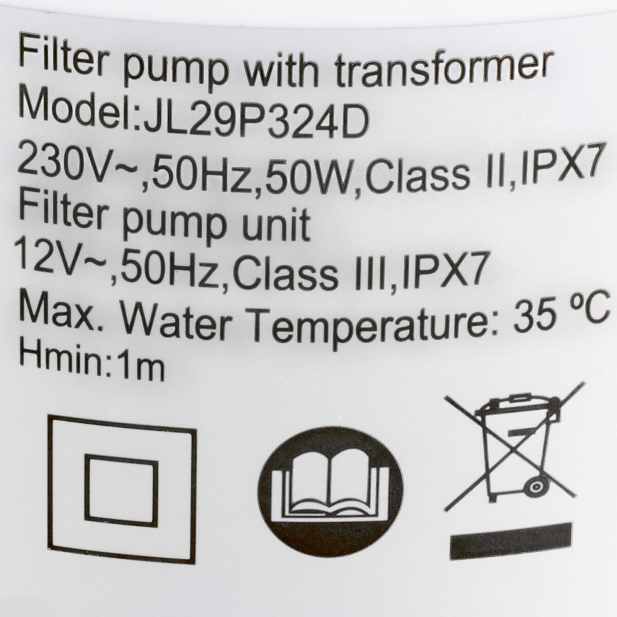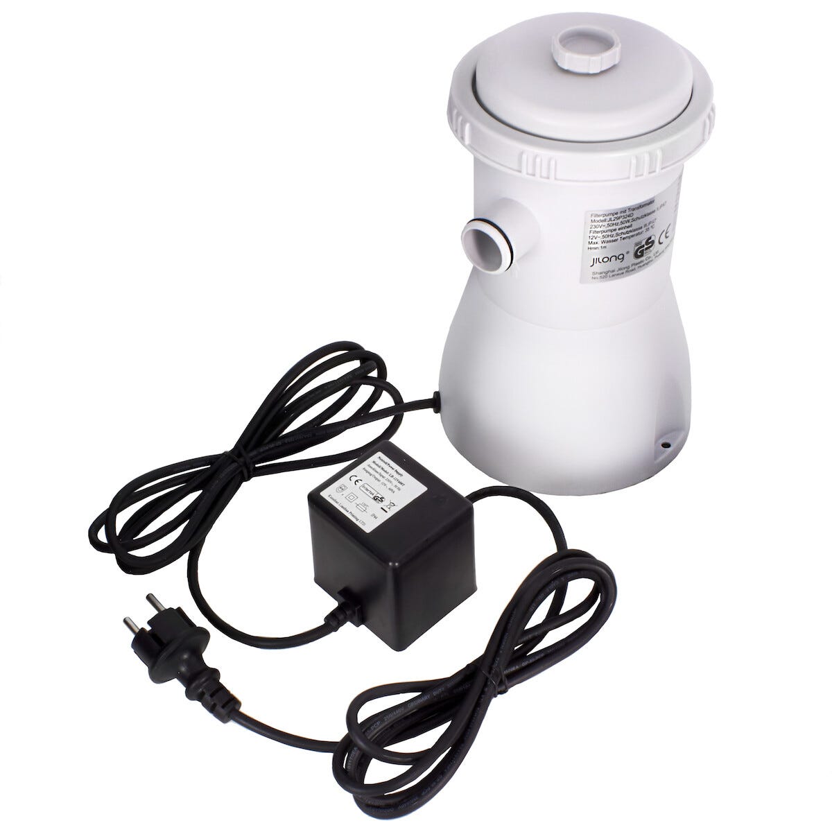 Filterpump inklusive slangar, filter & nätadapter till uppblåsbar pool (31-5005). Vattenflöde: 2000L/timme. Slang längd: 1 m, Ø 32 mm.