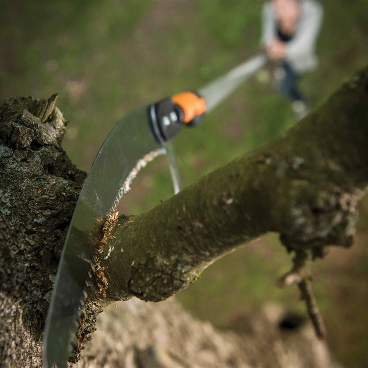 • Fiskars OneClick bågformad grensåg som passar för sågning högt uppe.