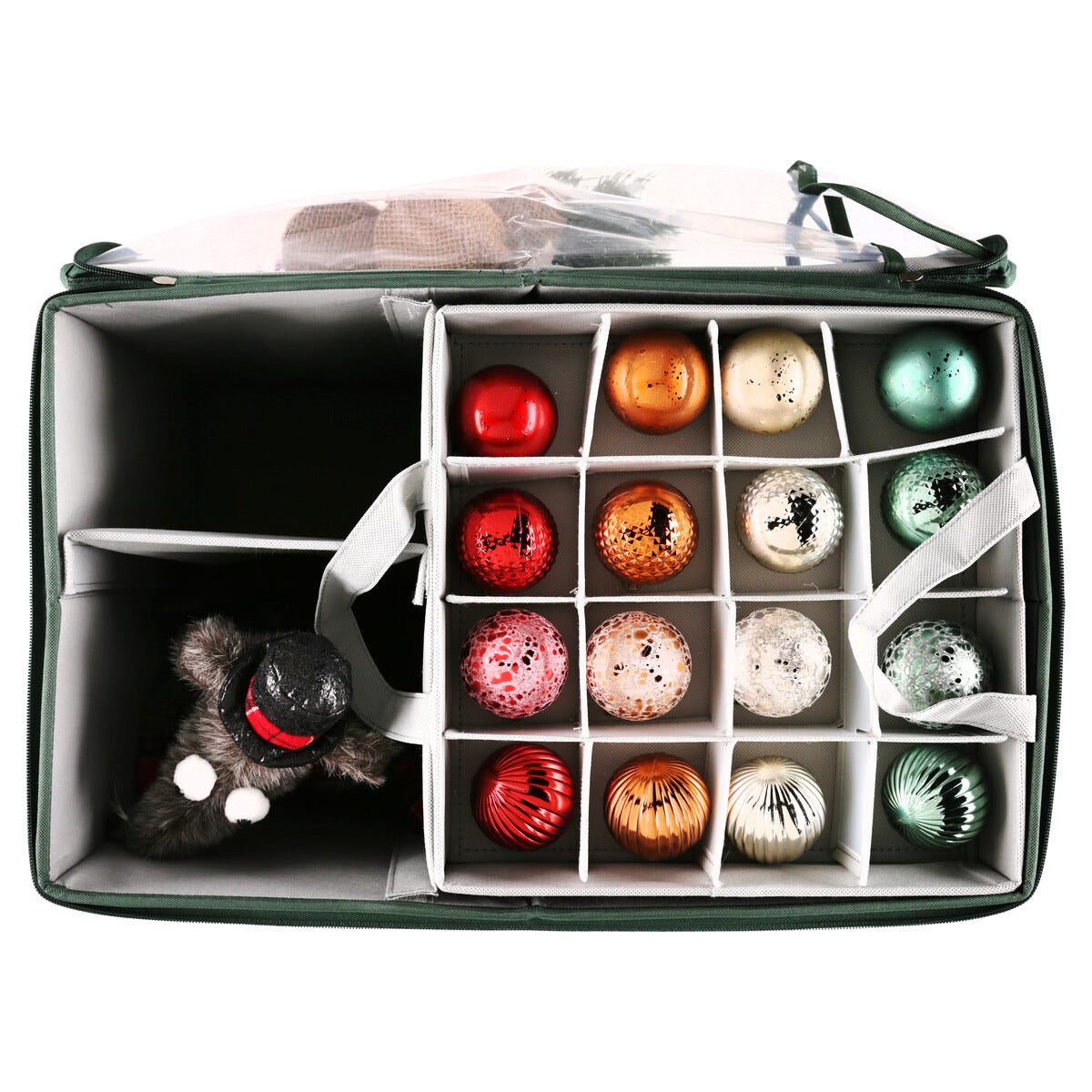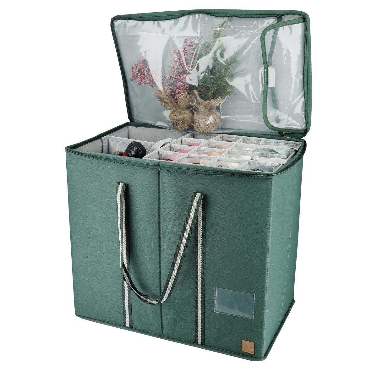 • Rejäl förvaring för julkulor – med lock, dragkedja och praktiska handtag.