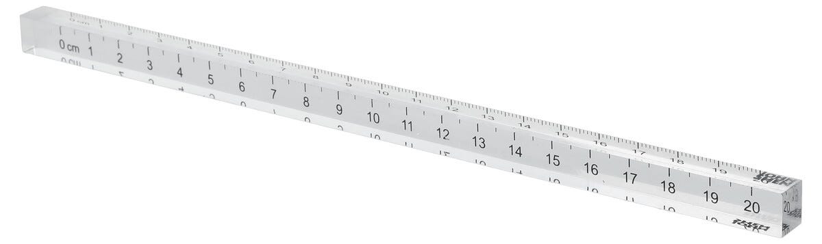 • Transparent linjal där centimeterskalan och linjer på pappret syns genom linjalen.