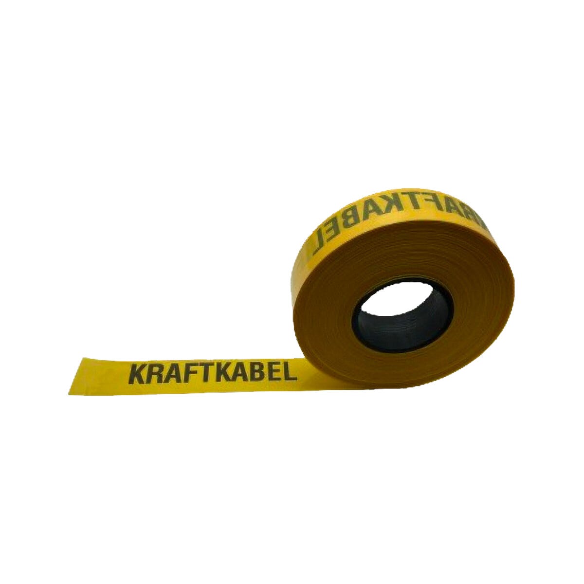 • Plastband i tydlig, gul färg med text ”Kraftkabel” – varnar för nedgrävd elkabel.