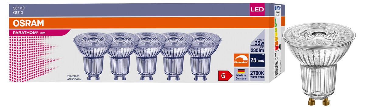 GU10 LED dimbar reflektorlampa 3,4 W, Osram PAR16, 5-pack