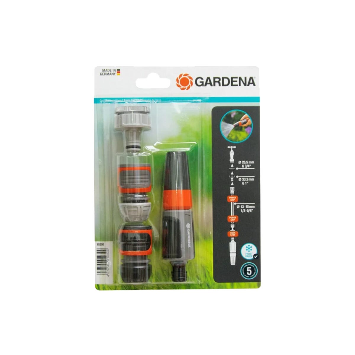 • Gardena grundsats – slangkopplingar och sprutmunstycke för rengöring/bevattning.