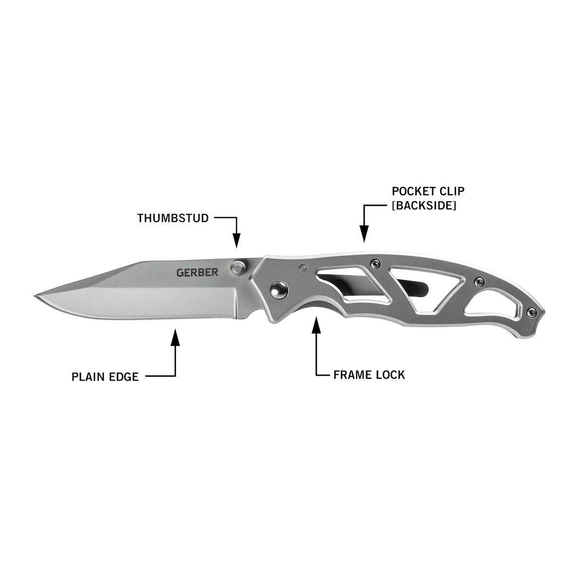 • Gerber Paraframe I från Paraframe-serien – känd för pålitliga och säkra knivar.