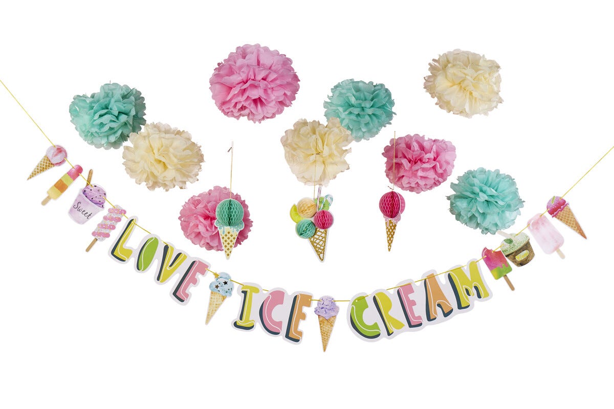 • Förvandla festlokalen till ett magiskt glassland – med pompoms, girlang och glassar.