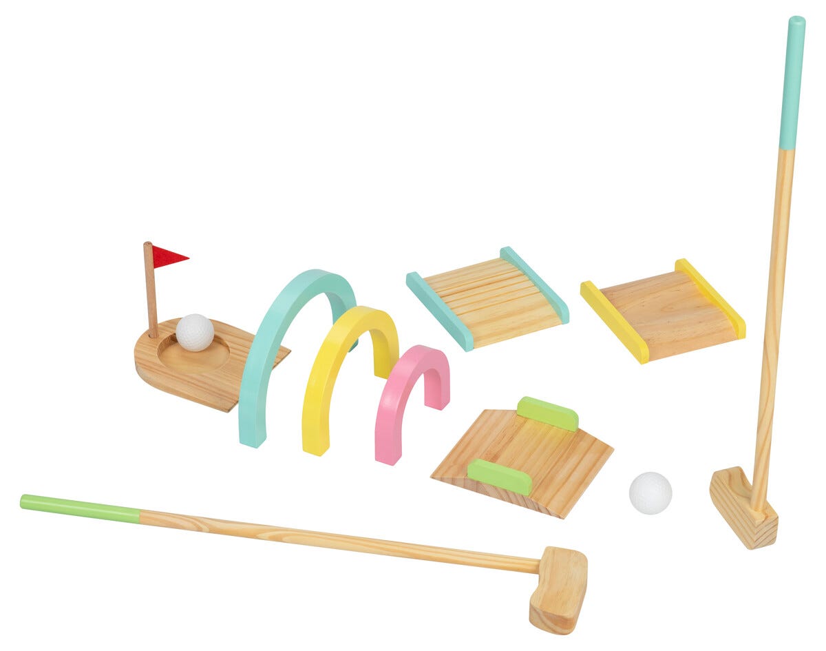 • Placera ut hål, bågar och hinder – 2 golfklubbor, 2 bollar och tillbehör i trä.