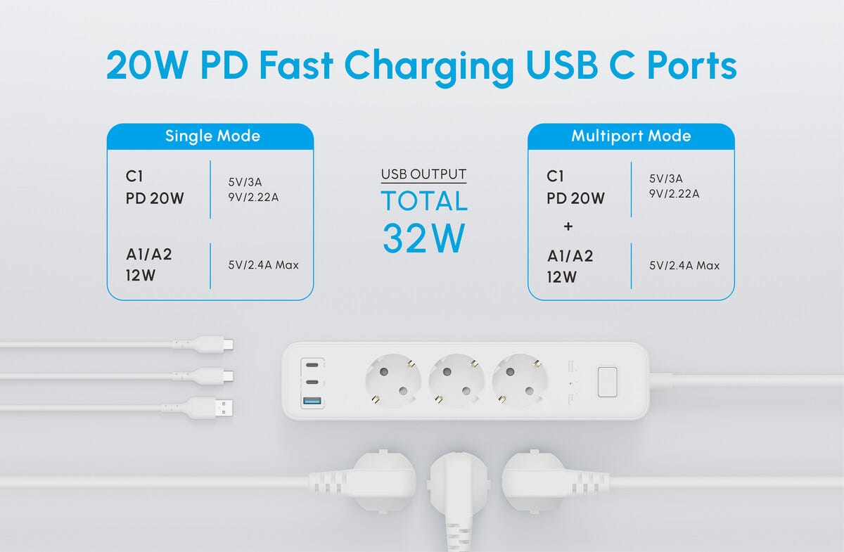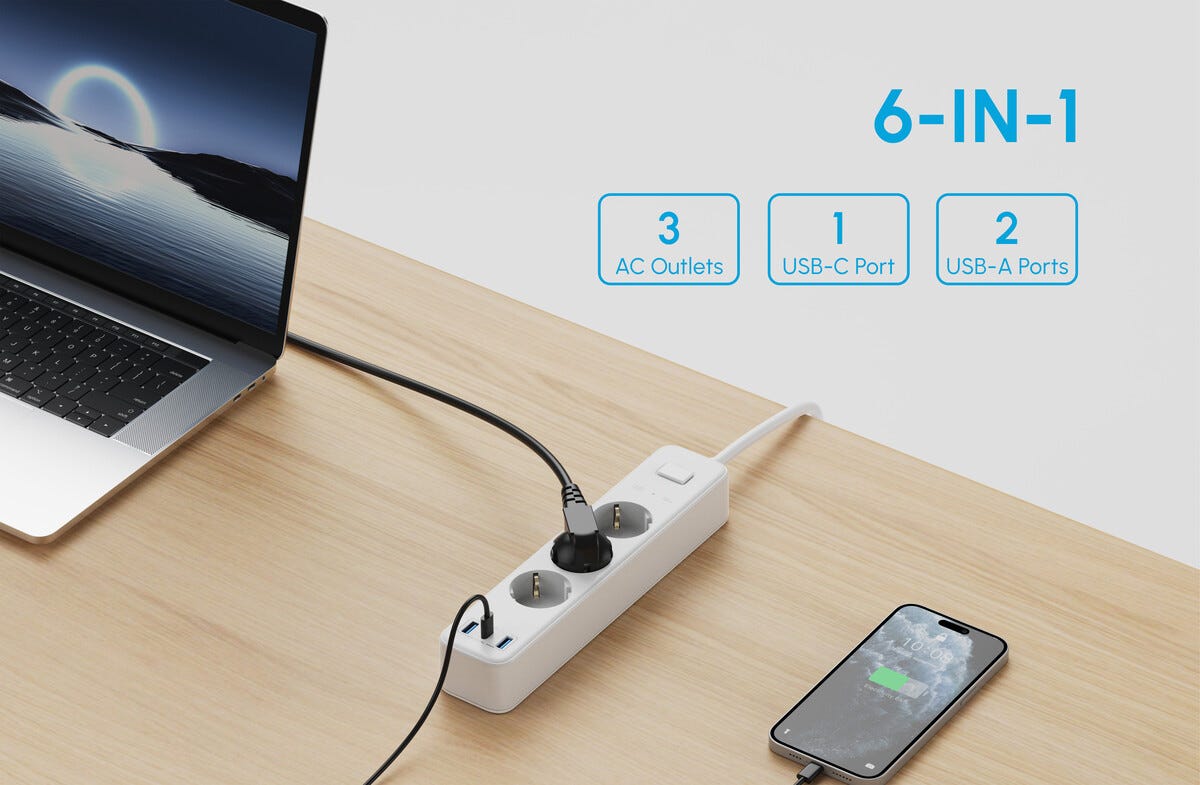 • Praktiskt 3-vägs grenuttag med USB-C- och USB-A – för hem och kontor.