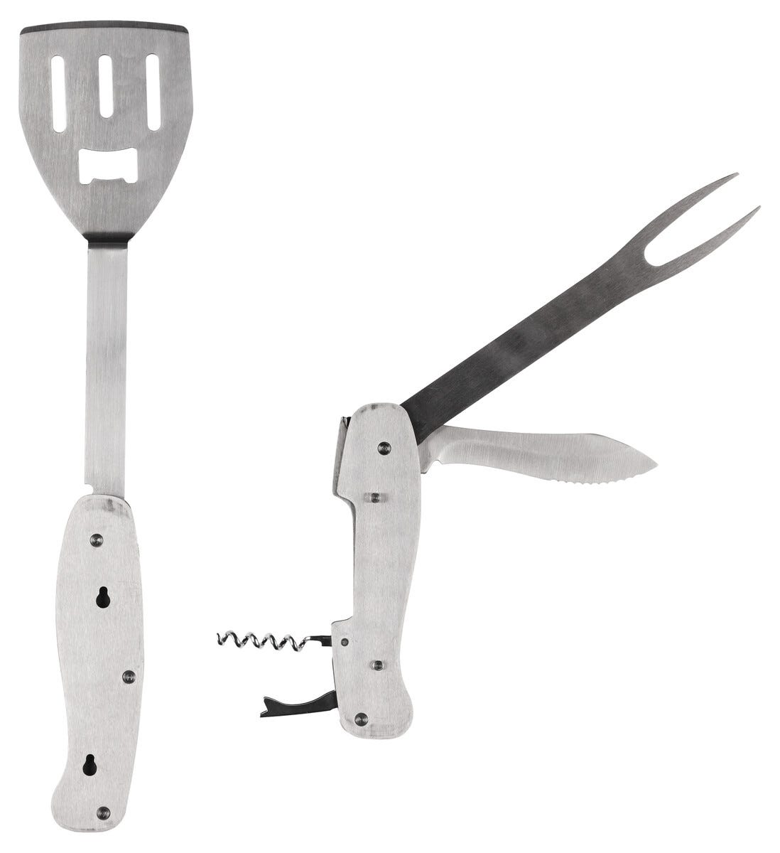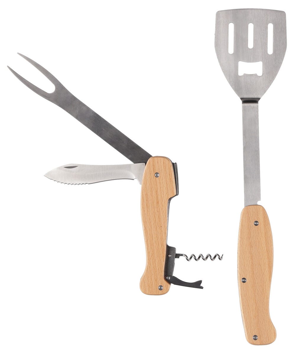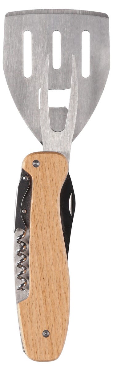 • Grillverktyg med stekspade, kniv, gaffel, flasköppnare och korkskruv.