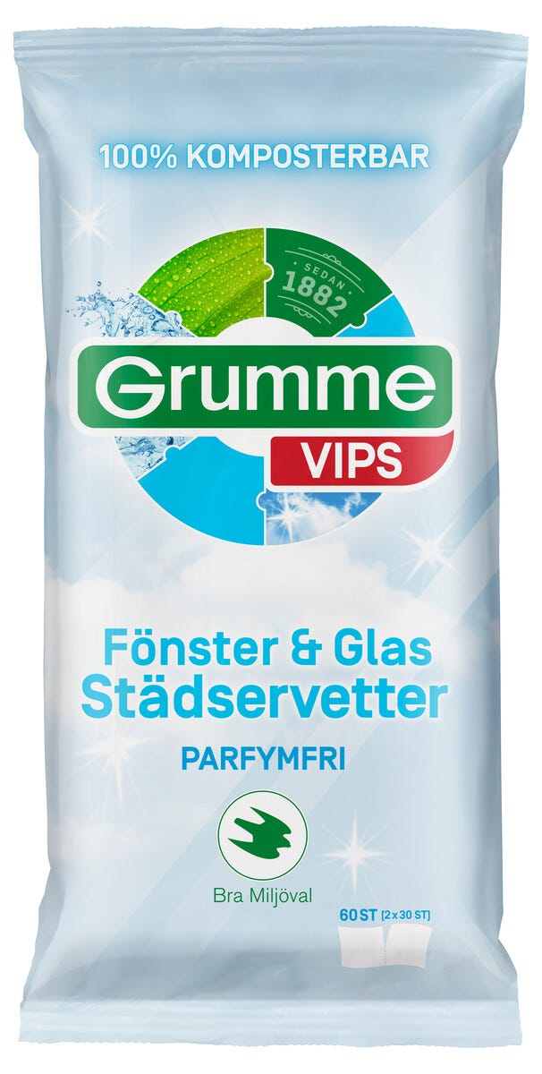 Grumme Vips städservetter fönster och glas, 60-pack