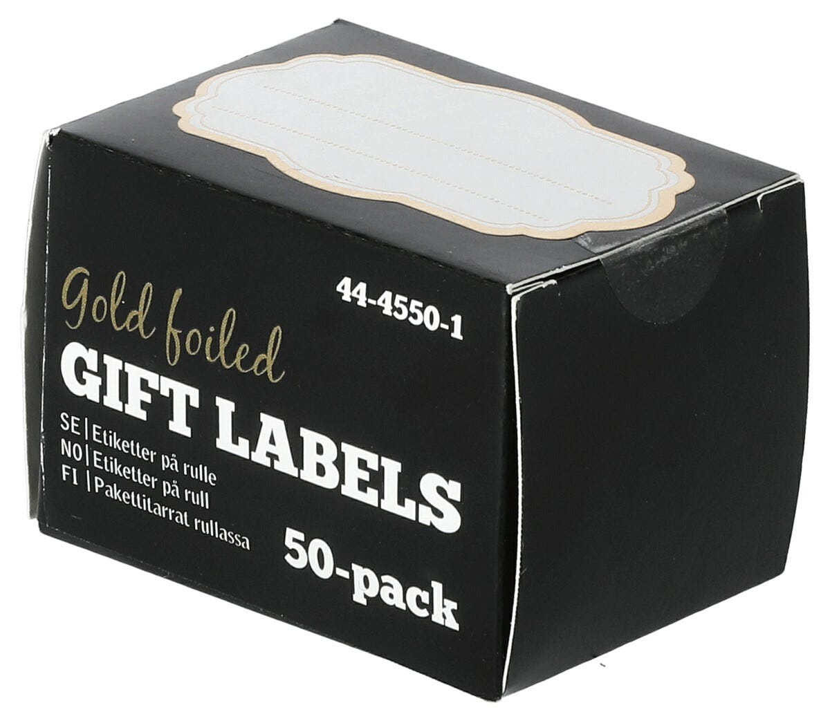 • Guldetikett på rulle – 50 etiketter med en snirklig guldram.