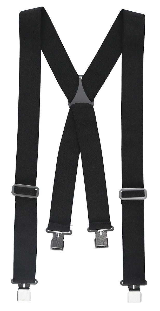 • 4 rejäla metallklämmor som knäpps fast i byxlinningen.