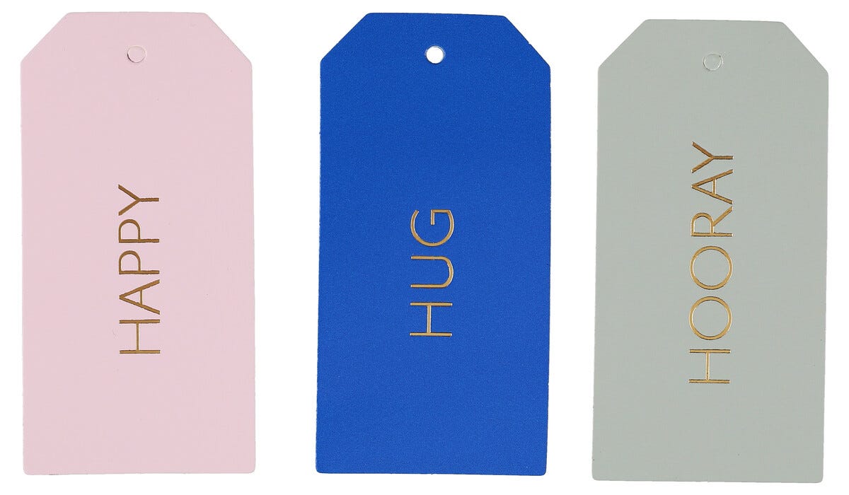 • Etiketter med hål – 3 olika färger och med glada ord (Happy, Hug och Hooray).