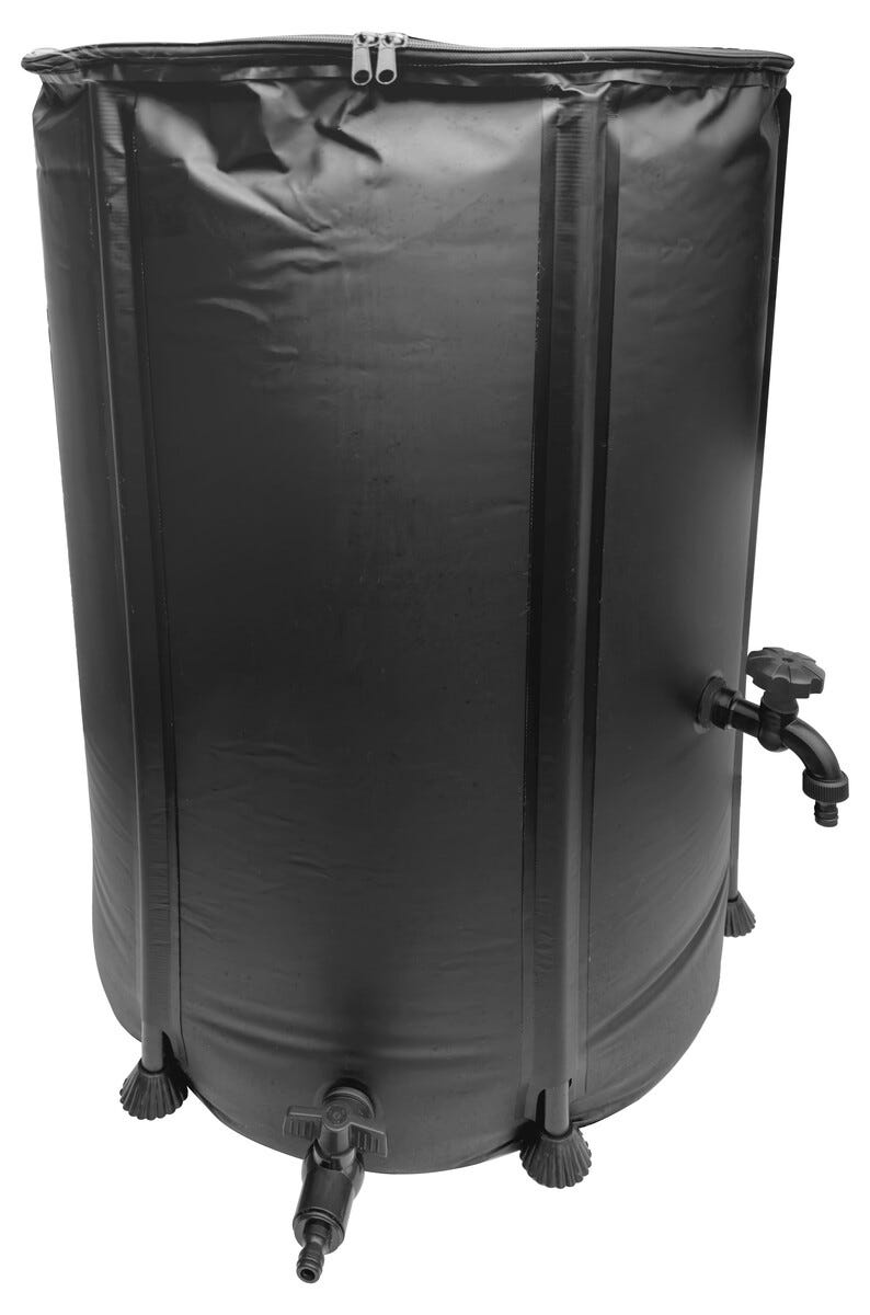 • Vattentunna med kran och lock med nätfilter – ¾-tums slangkoppling.