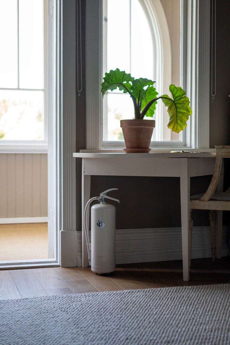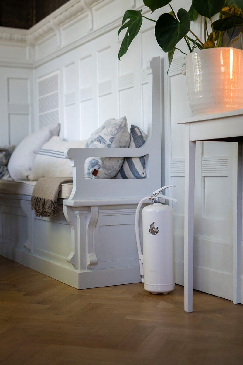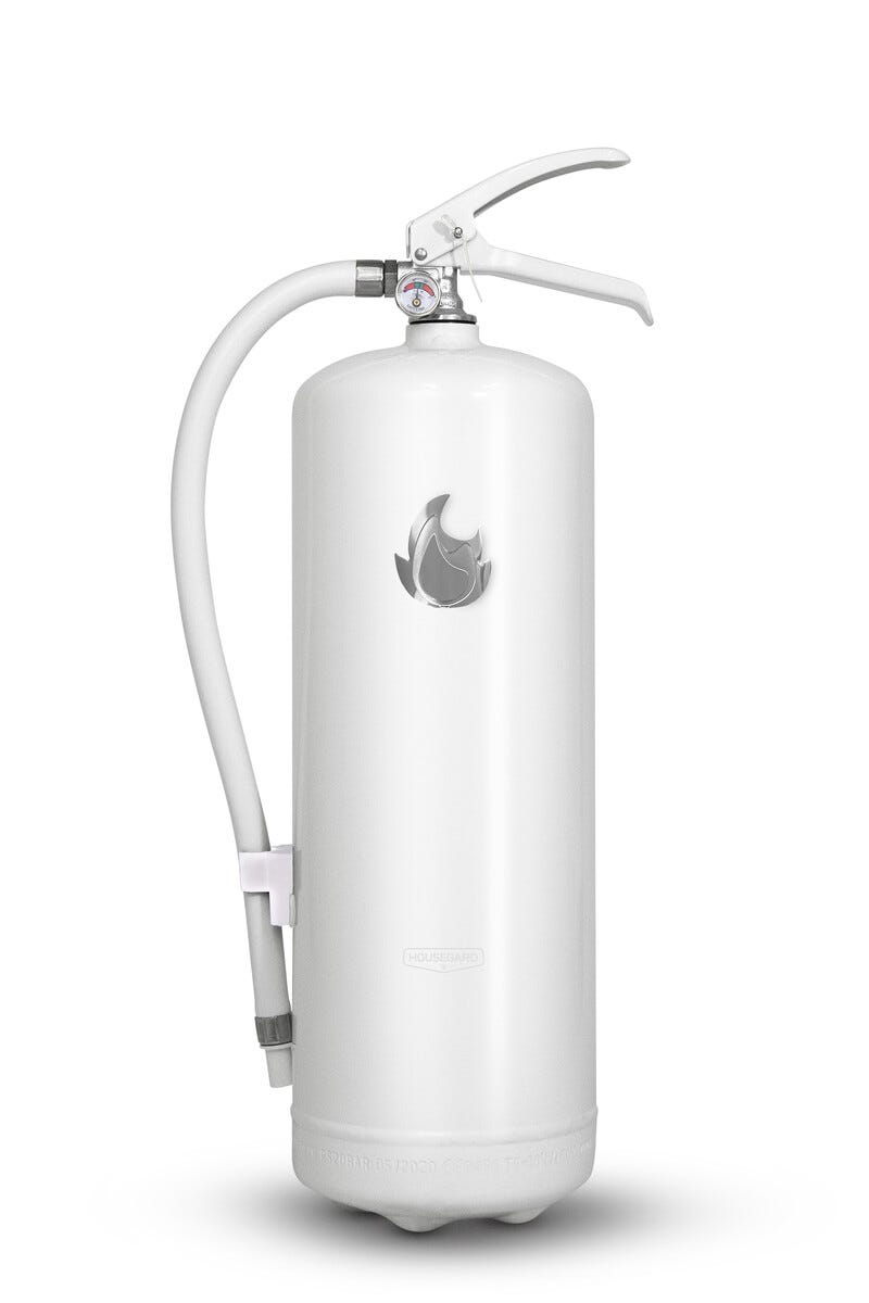 • Housegard Design pulversläckare – kombinerar säkerhet och design i vit/silver.