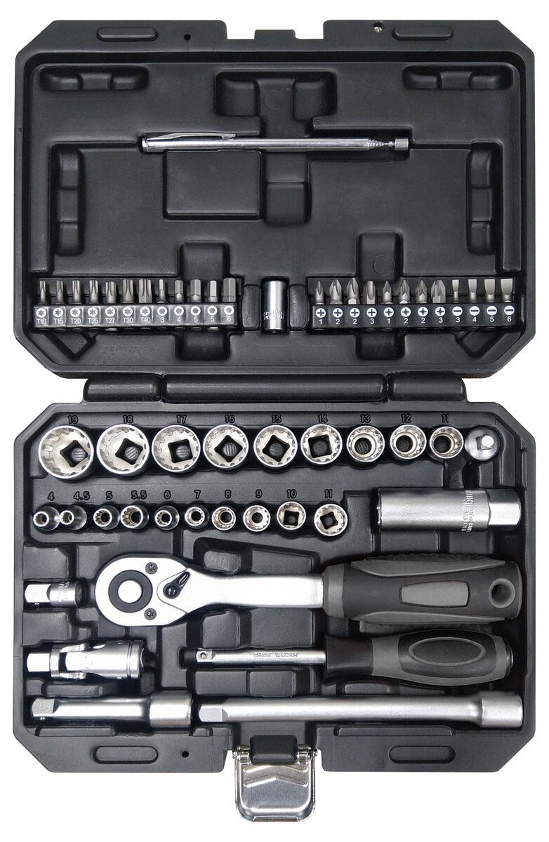 • Spärrskaft, förlängare, hylsor och bits – allt i en låda.