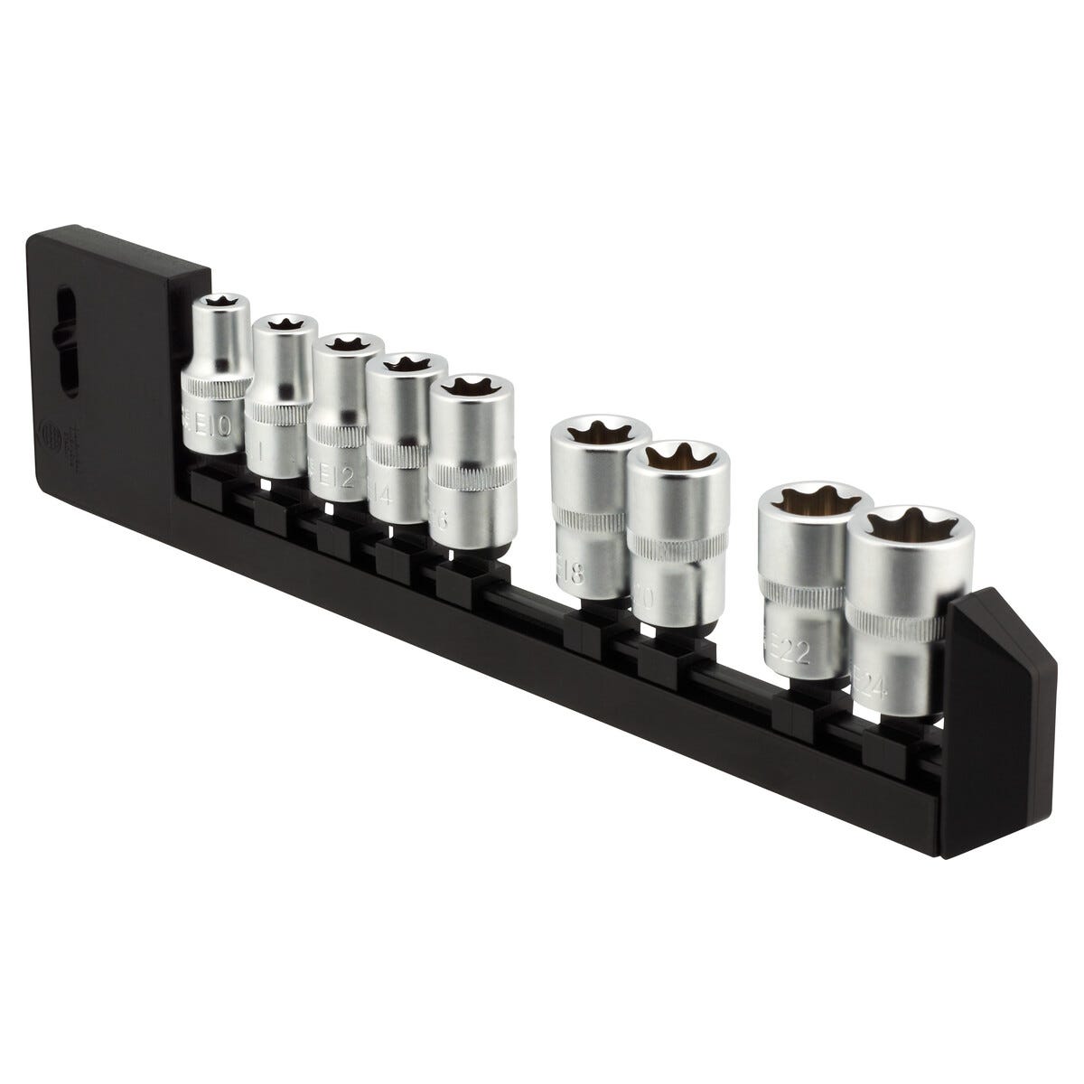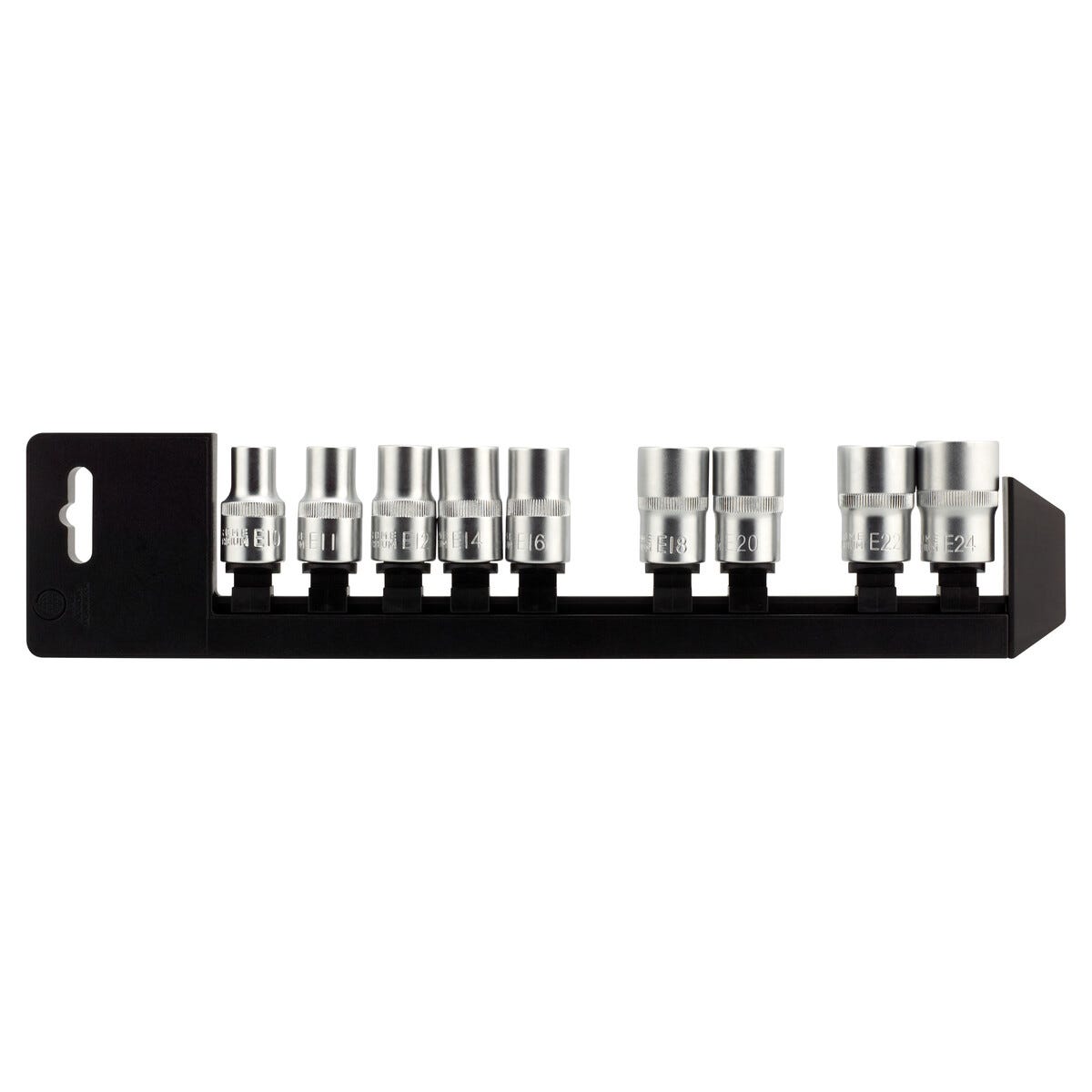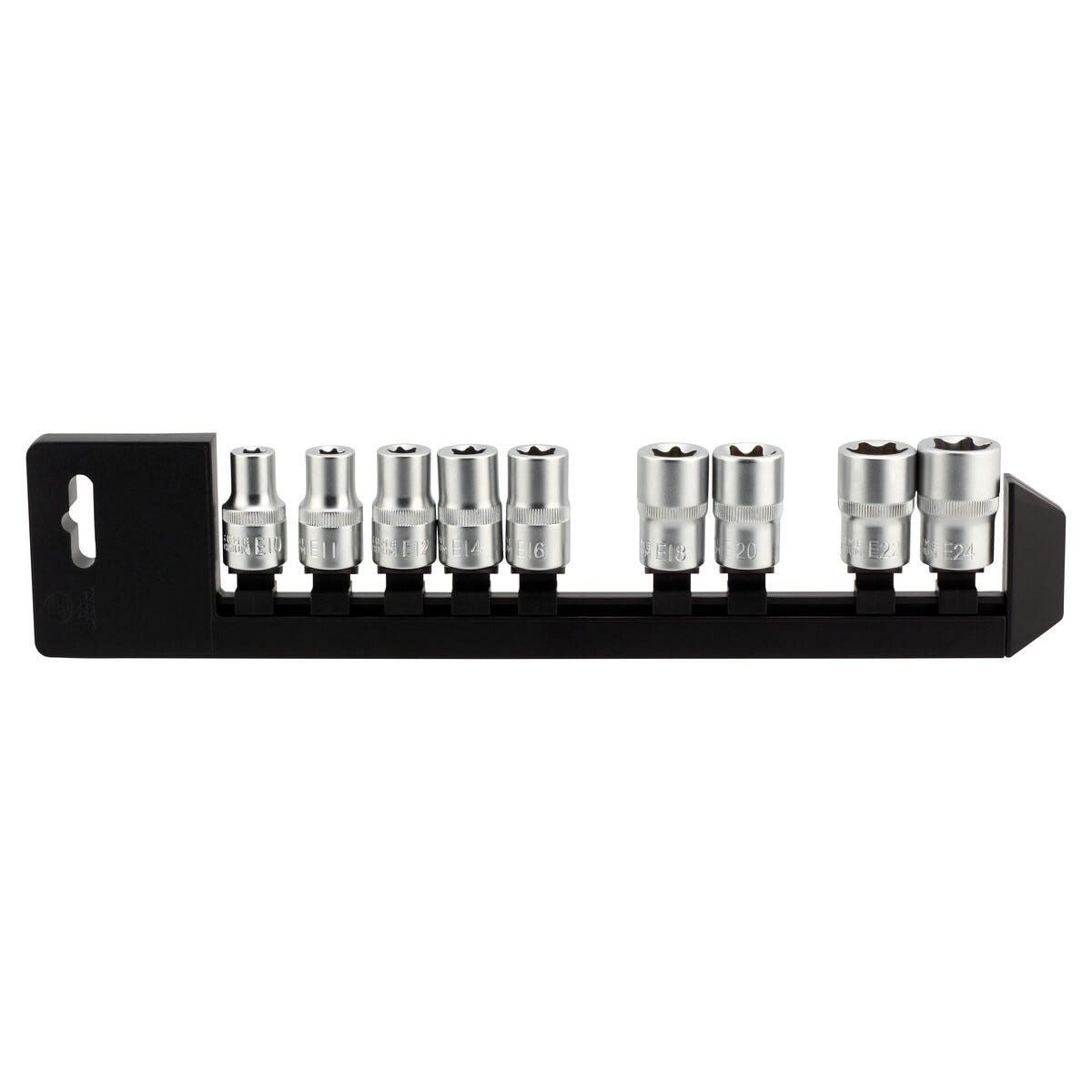 • 9 hylsor av högvärdigt mattförkromat kromvanadiumstål med 1/2"-fäste.