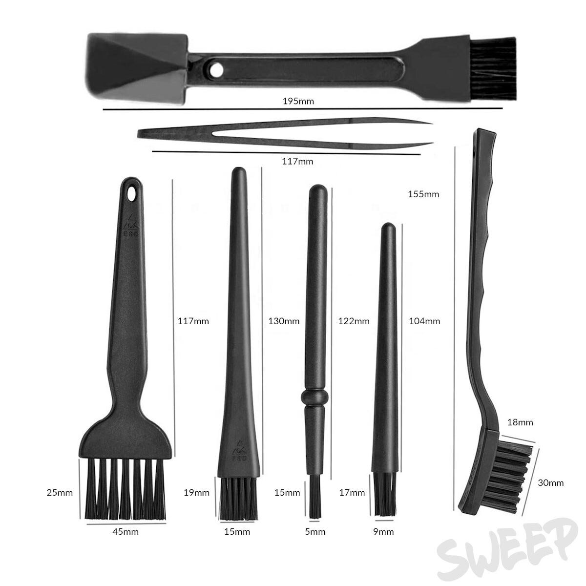 • Rengör känslig elektronik med 1 pincett och 6 borstar i olika storlekar.