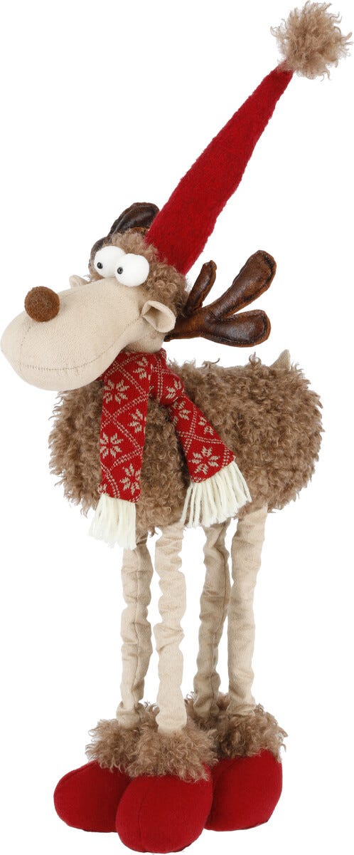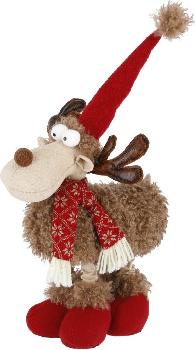 • Renen har en stickad halsduk och röd tomteluva för klassisk julkänsla.