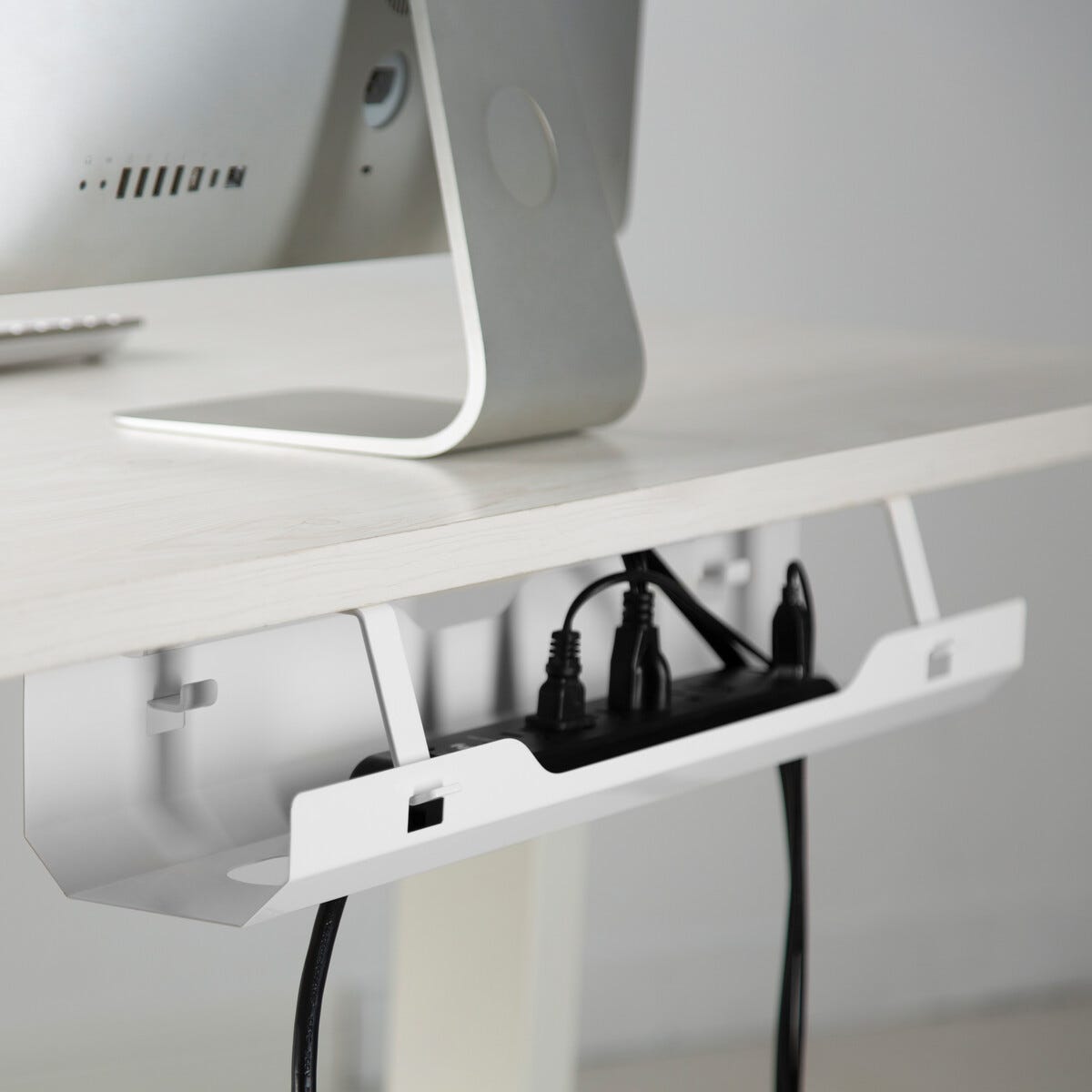 • Kabehållare skrivbord – vit kabelkanal i pulverlackerad metall.