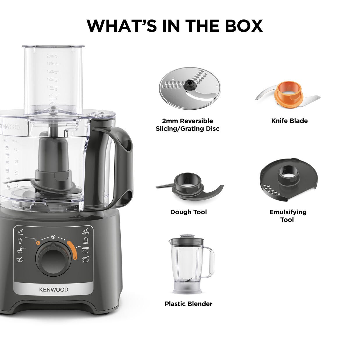 • 1,2 liters blender, knivblad, skiv-/rivskiva 2-i-1, visp, degkrok, slickepott ingår.