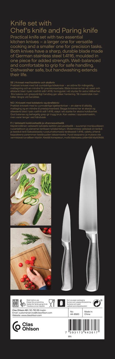• Knivset med kockkniv och skalkniv – bra balans och greppvänligt handtag.