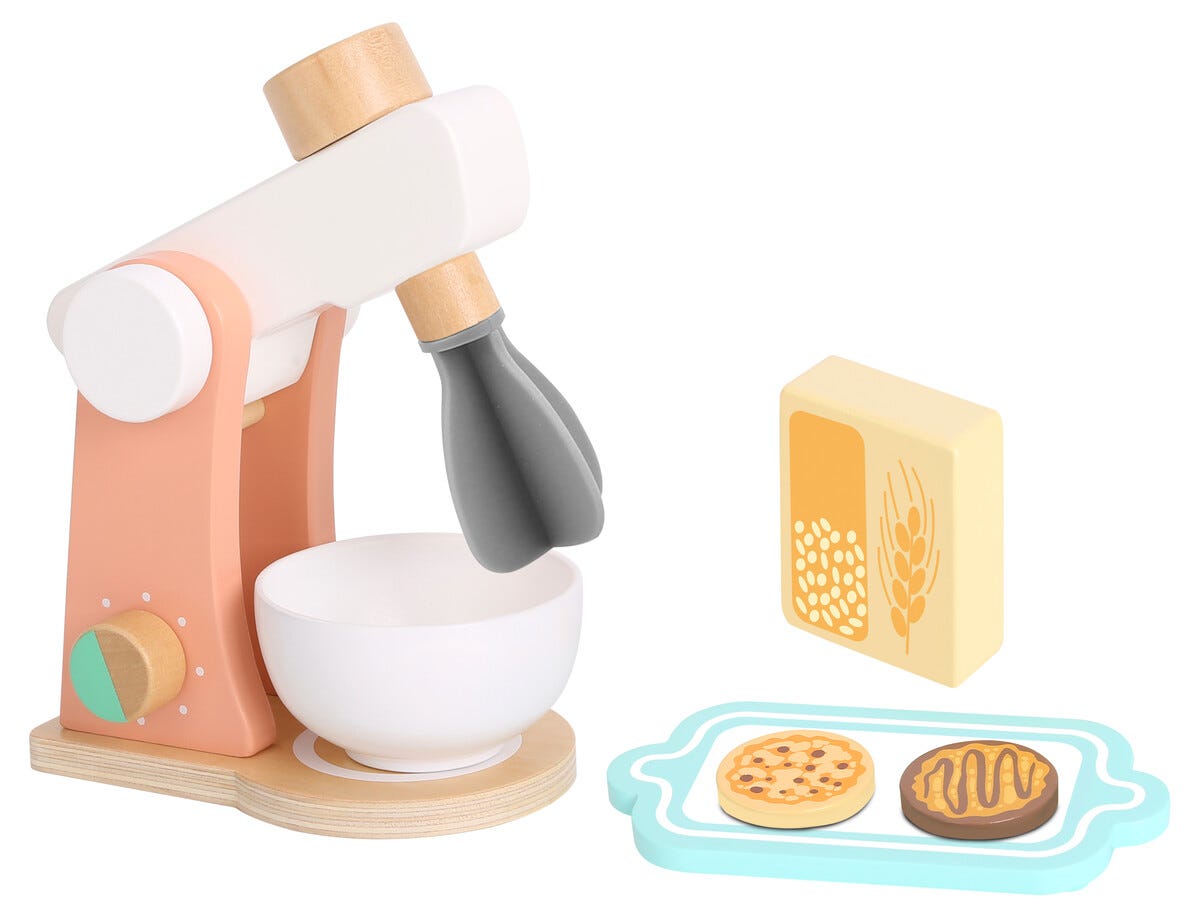 • Köksmaskin för barn – med 7 delar i trä; maskin, skål, baktillbehör m.m.