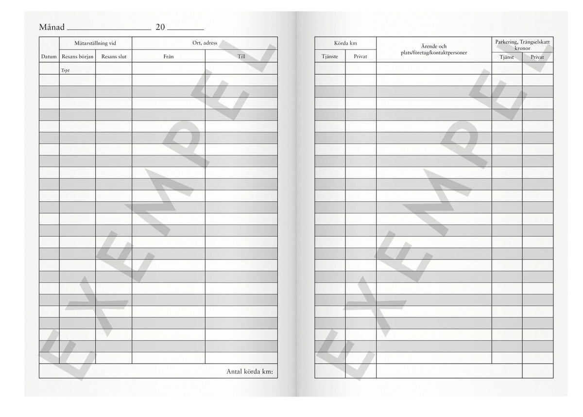 • Kolumner för datum, mätarställning, besökta platser m.m.