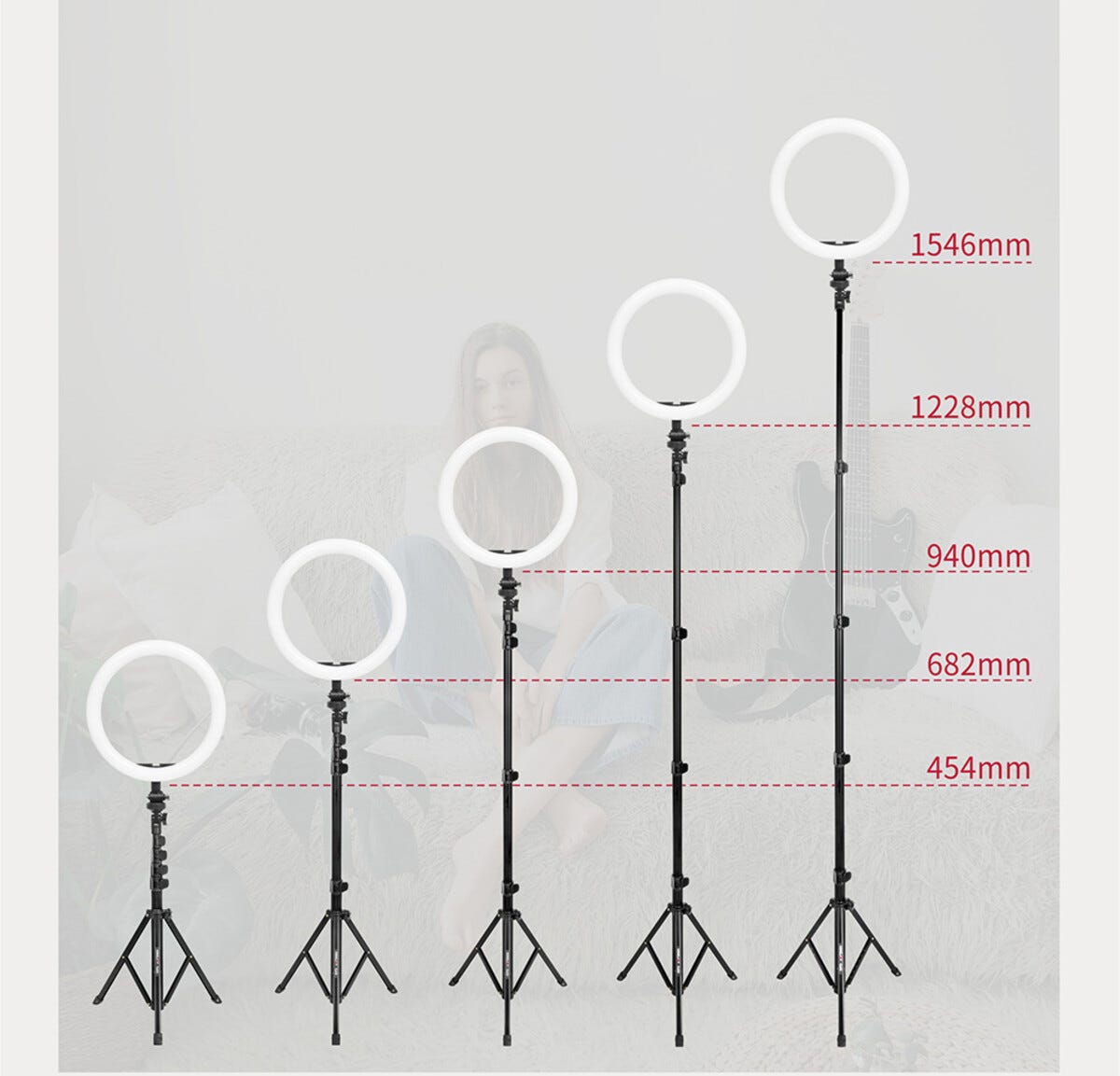 • Ringlampa med stabilt stativ med 360 graders roterbart huvud – höjd upp till 155 cm.