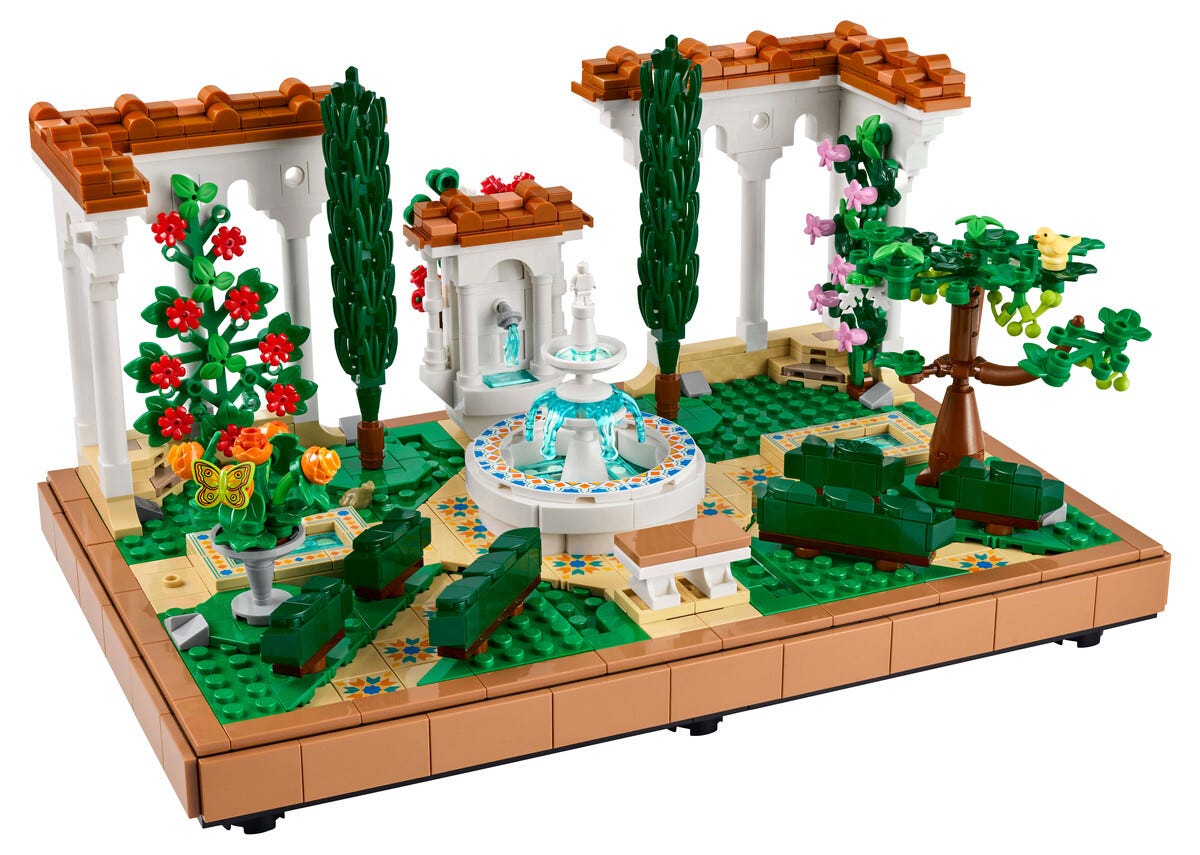 • Detaljerad LEGO-modell med fontän, pergolor, cypresser och blommande växter.