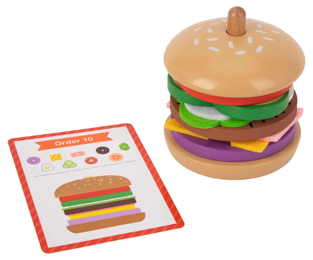 • Lekset hamburgare i trä – lägg på kött, ost, grönsaker enligt de olika recepten.