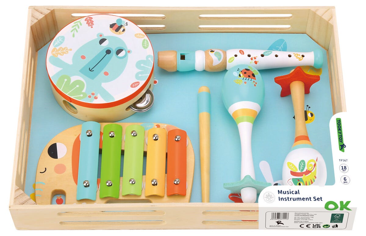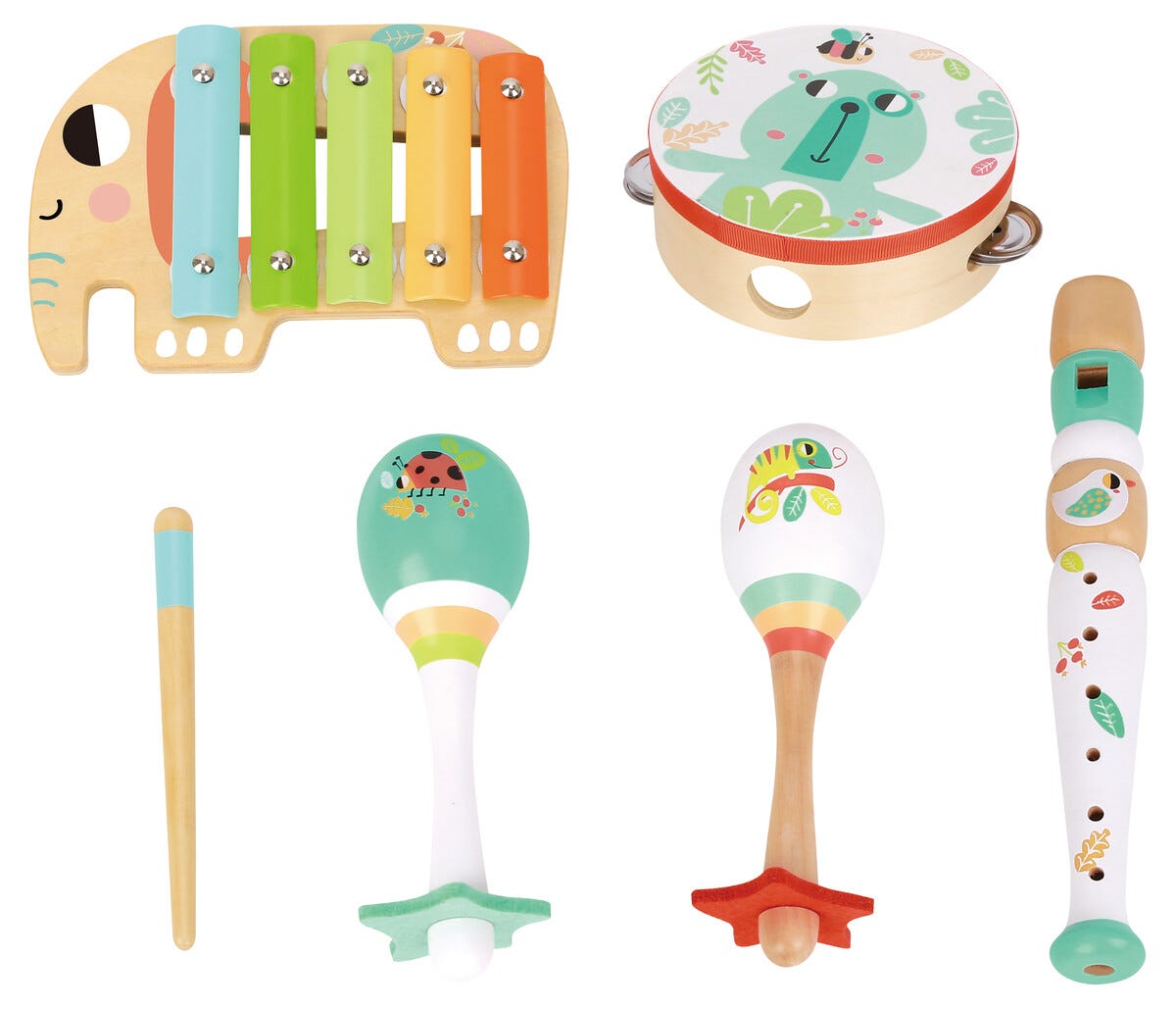 • Upptäck takt och ton med flöjt, xylofonen, trumma och maracas i trä.