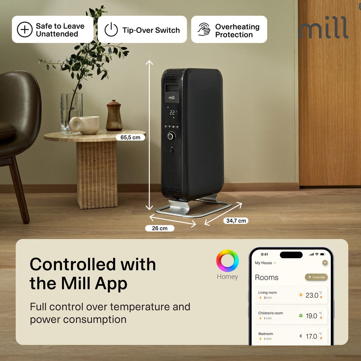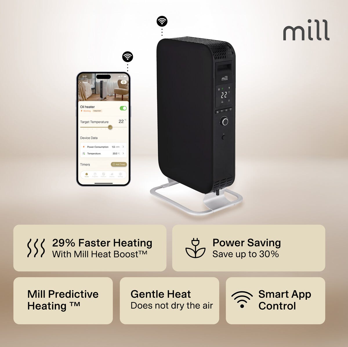 Mill Gentle Air oljeelement med WiFi värms upp jämt ö...