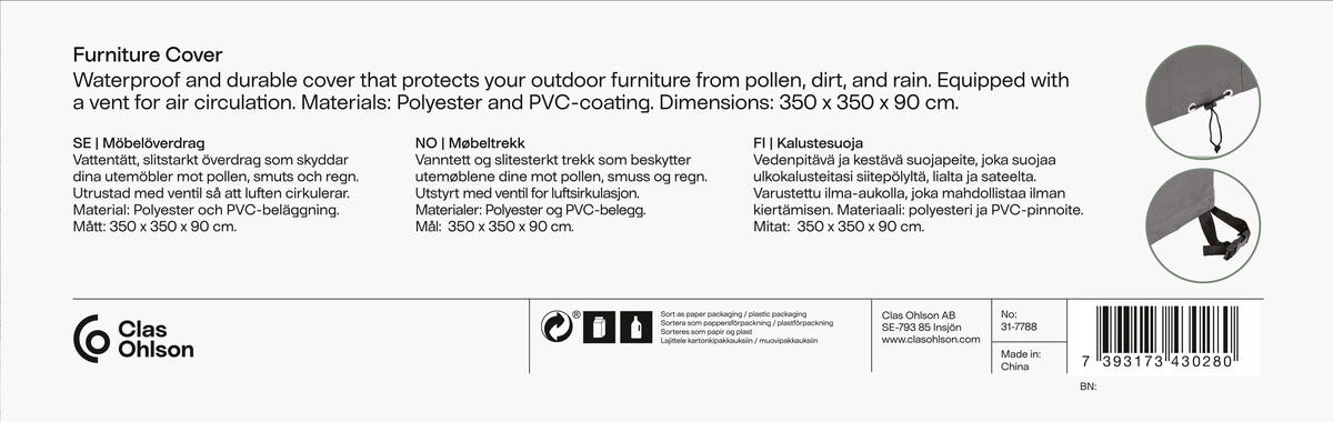 • Mått: 350 x 350 x 90 cm – täcker loungemöbler, bord, stolar och dynlåda.