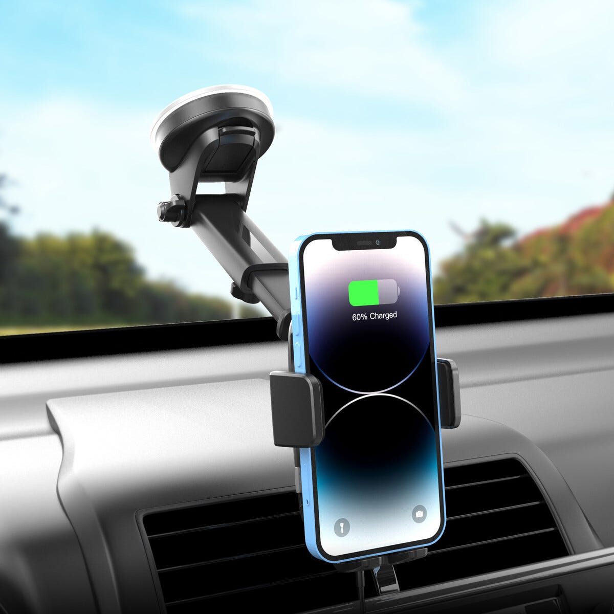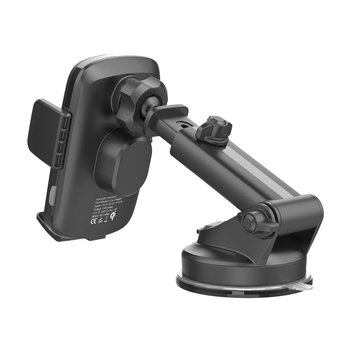 Mobilhållare bil med klämfäste och trådlös Qi, sugpropp