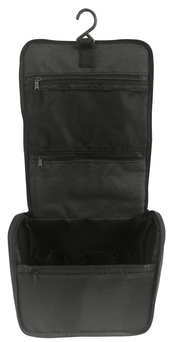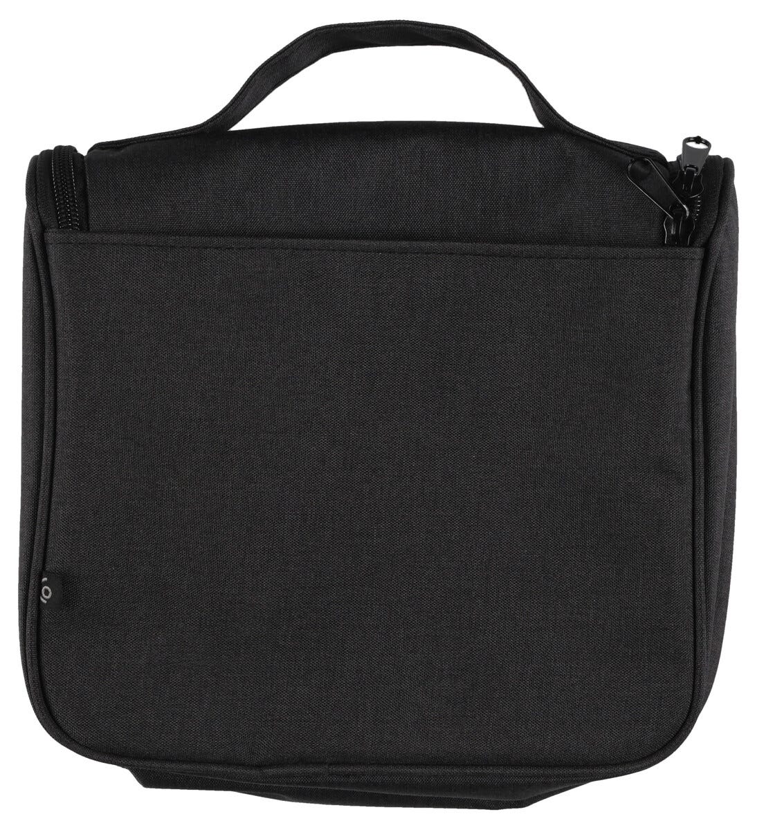 • Svart, stilren toalettväska med både upphängningskrok och bärhandtag.