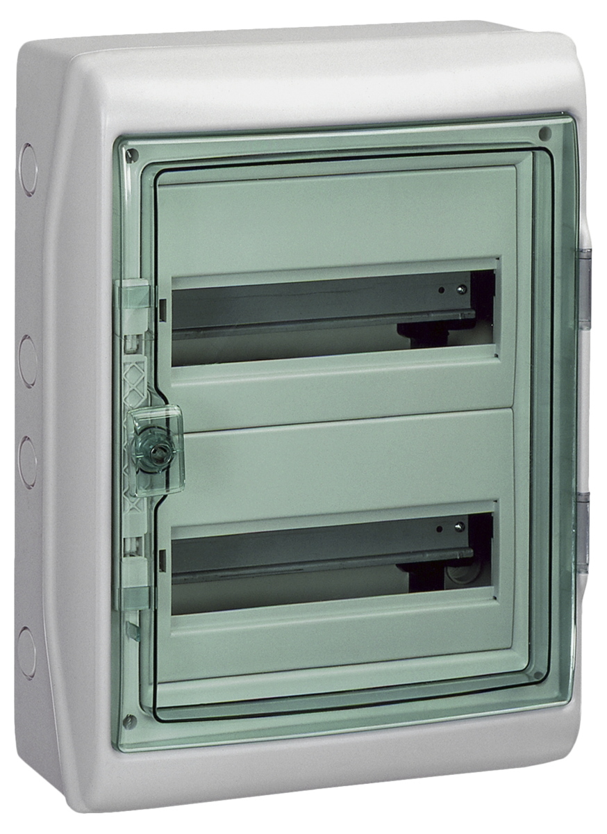• För utanpåliggande montering – vattentät kapsling med 24 modulplatser.