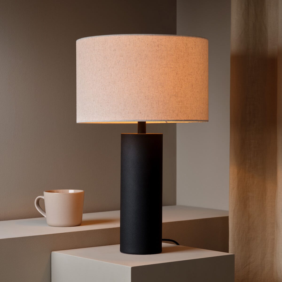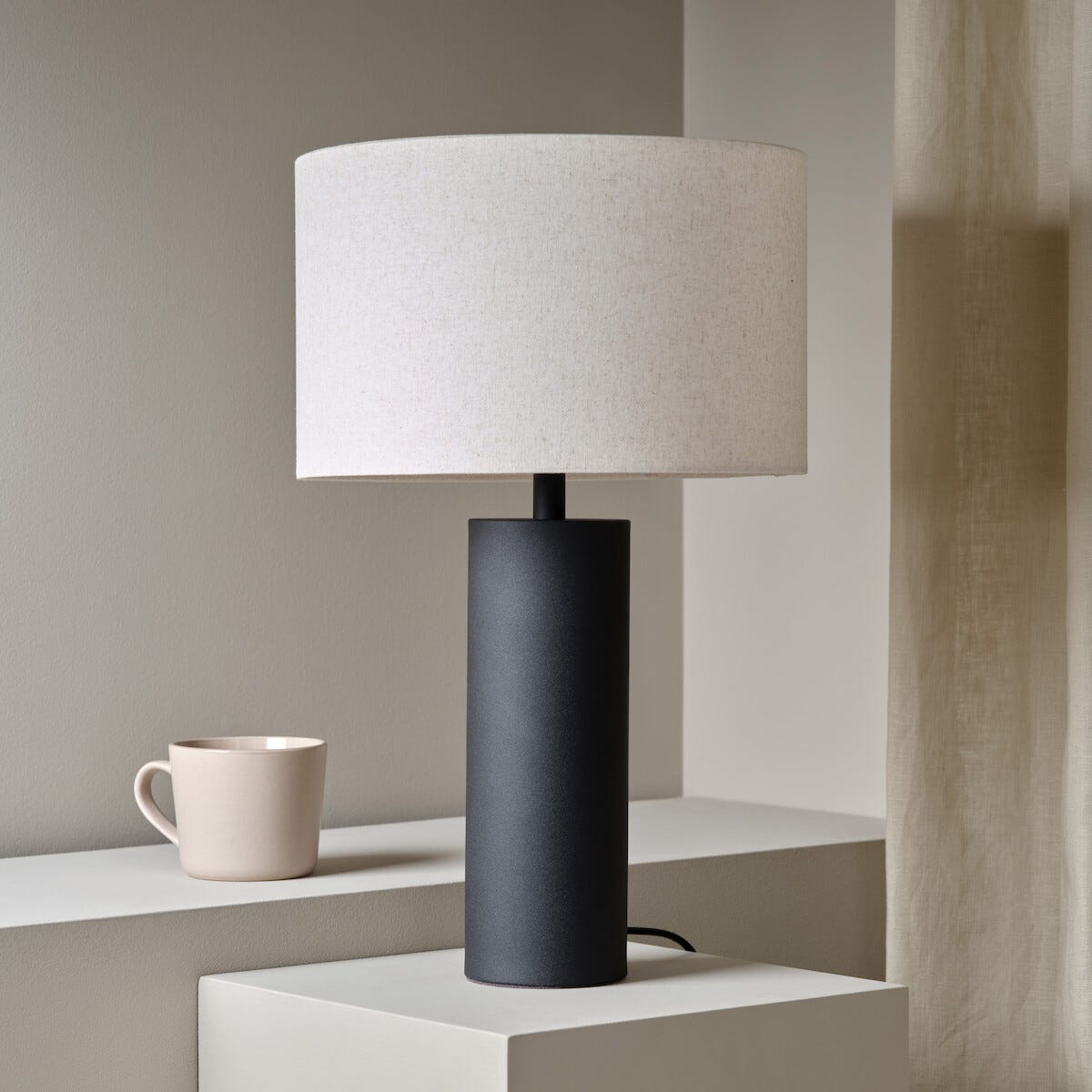 • Lampfot i svart metall och lampskärm i ljust tyg – passar alla inredningsstilar.