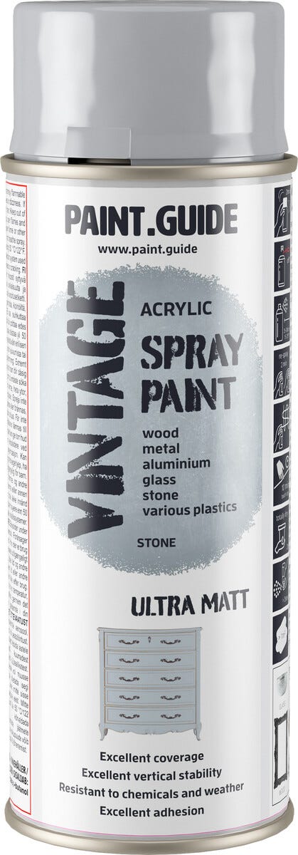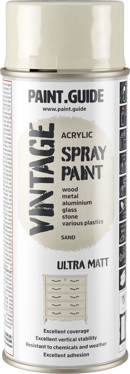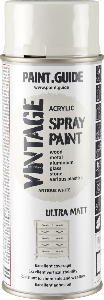 • Paintguide Vintage sprayfärg – snabbtorkande akryl som påminner om kalkfärg.