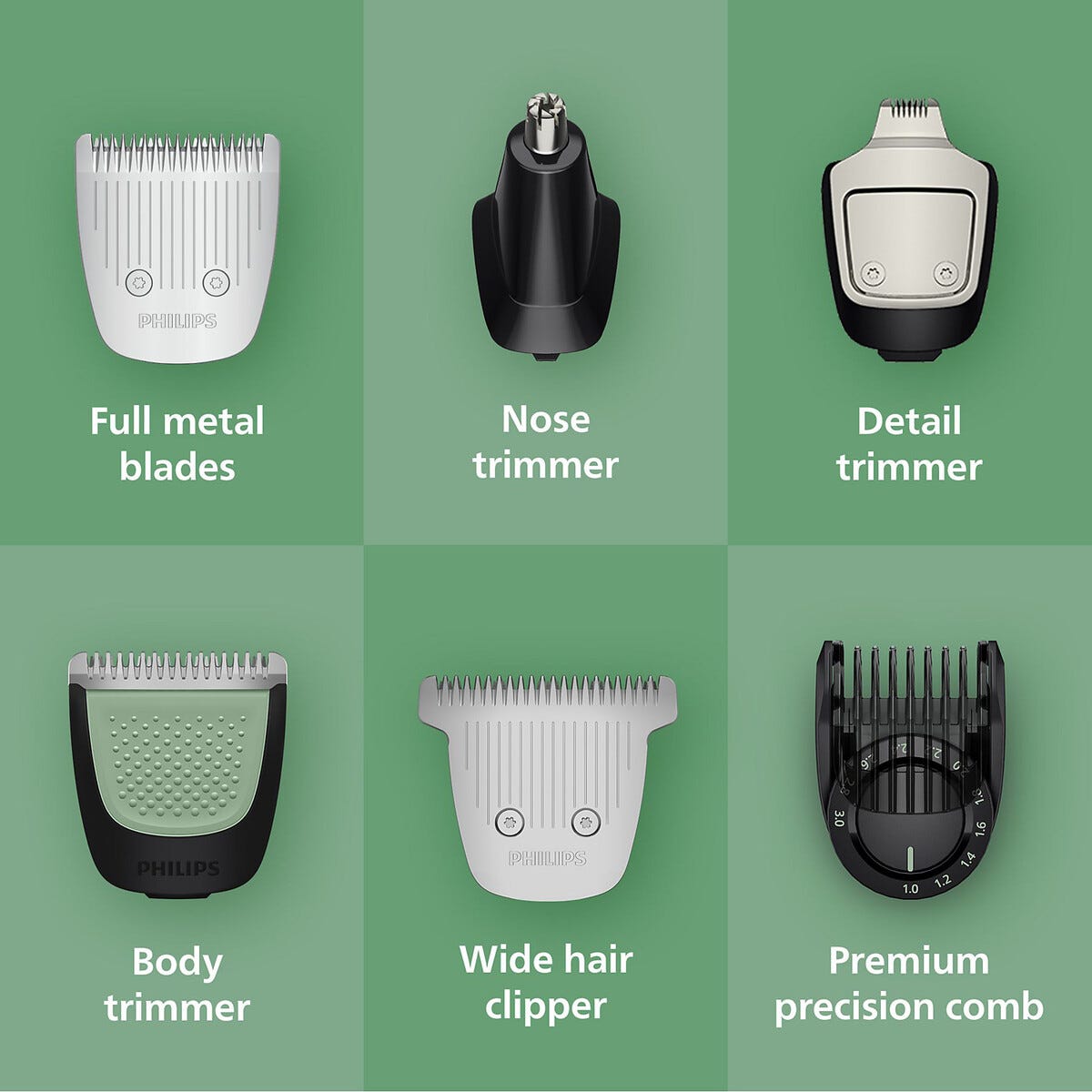 • Trimma skägg, hår, kropp och näshår med en och samma multitrimmer.