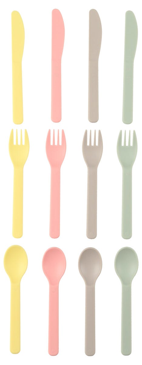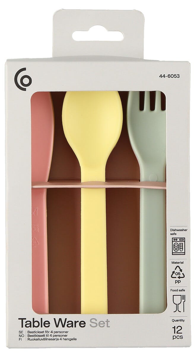 • 4 plastknivar, 4 plastgafflar, 4 plastskedar – varje set har en egen färg.