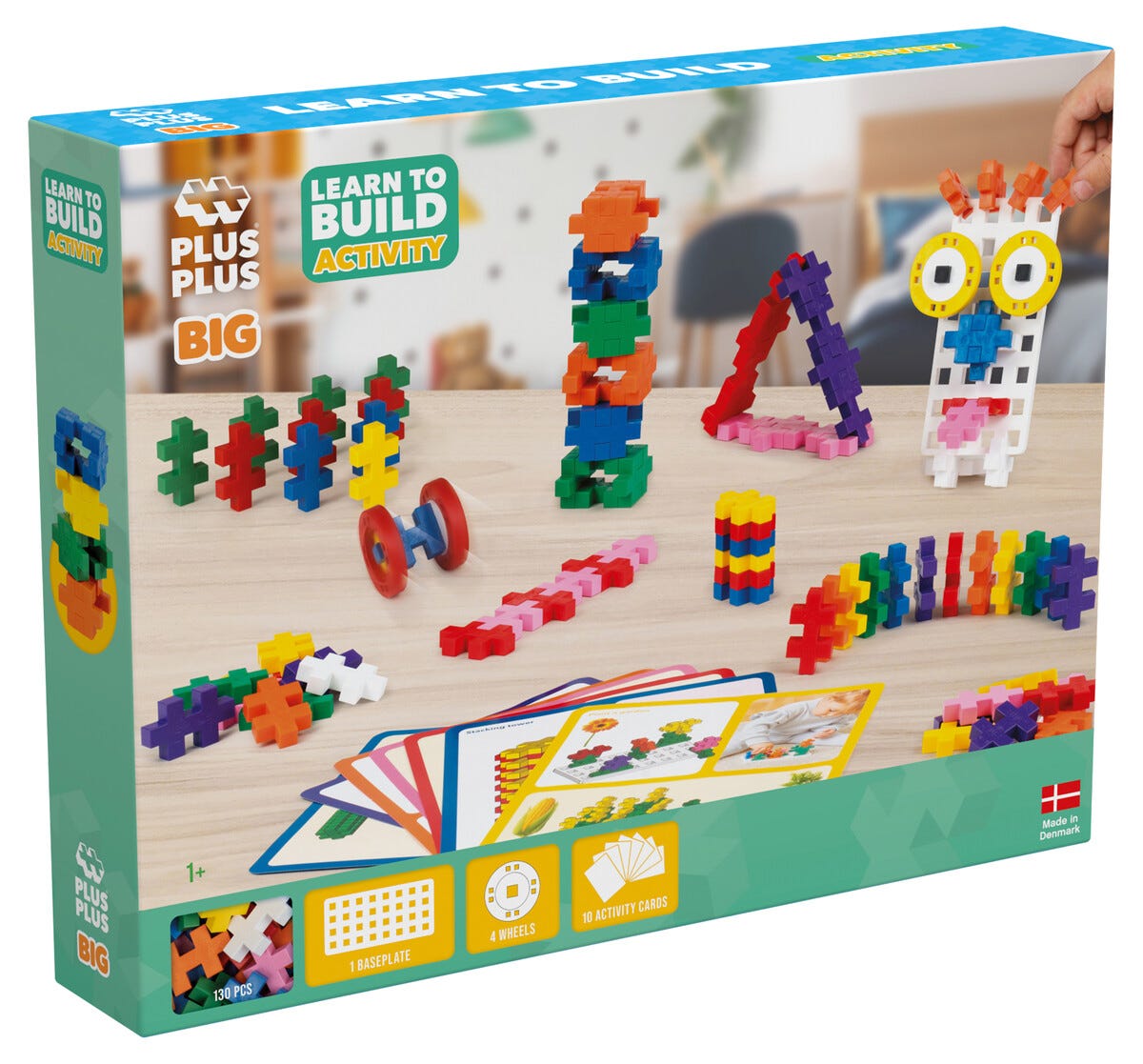 • Plus-Plus BIG med 10 dubbelsidiga aktivitetskort, 1 byggplatta och 4 hjul.