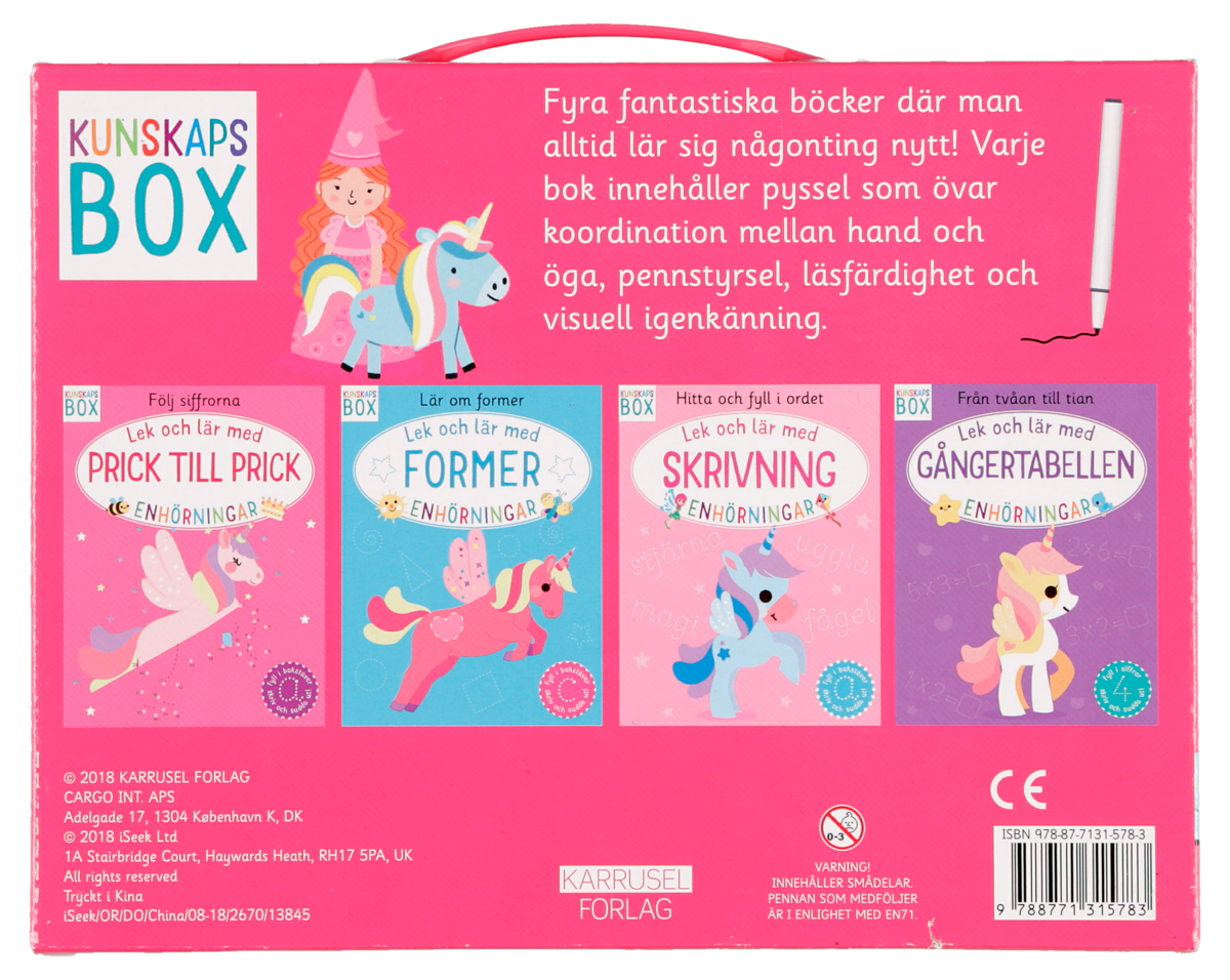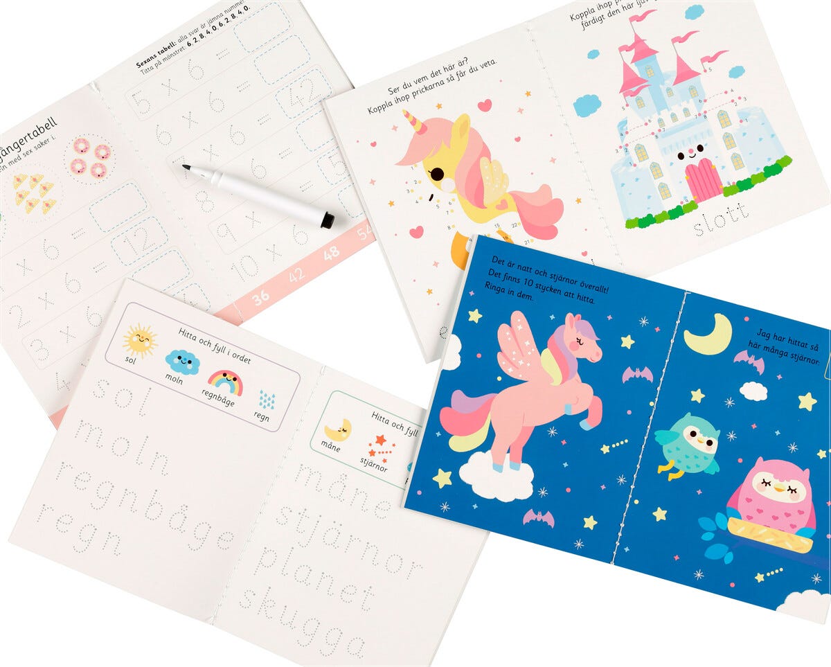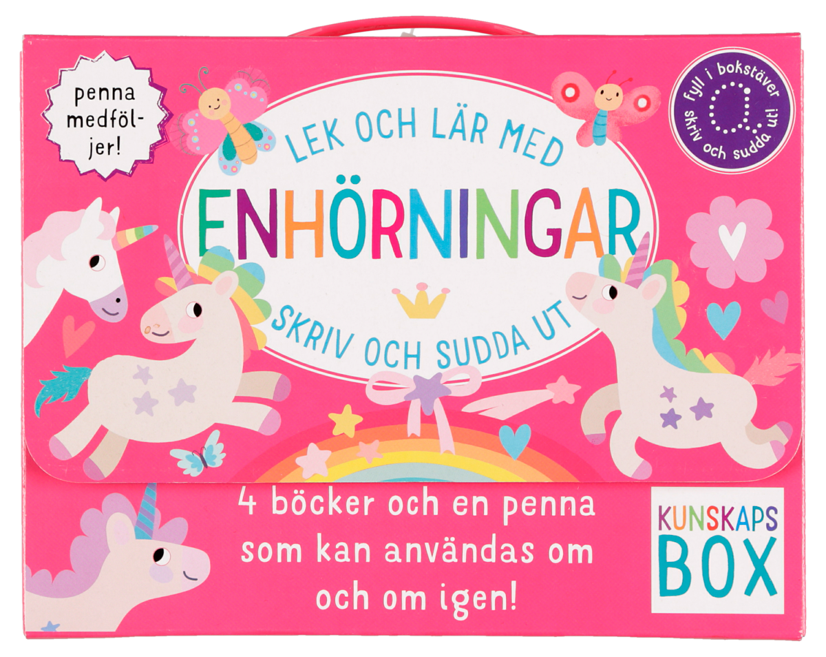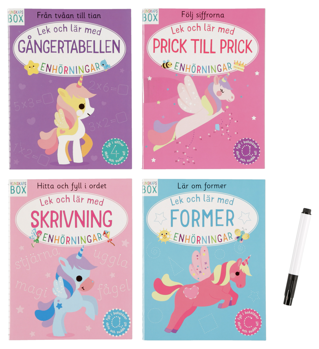 • Box med 4 pysselböcker och en penna där texten går att sudda.
