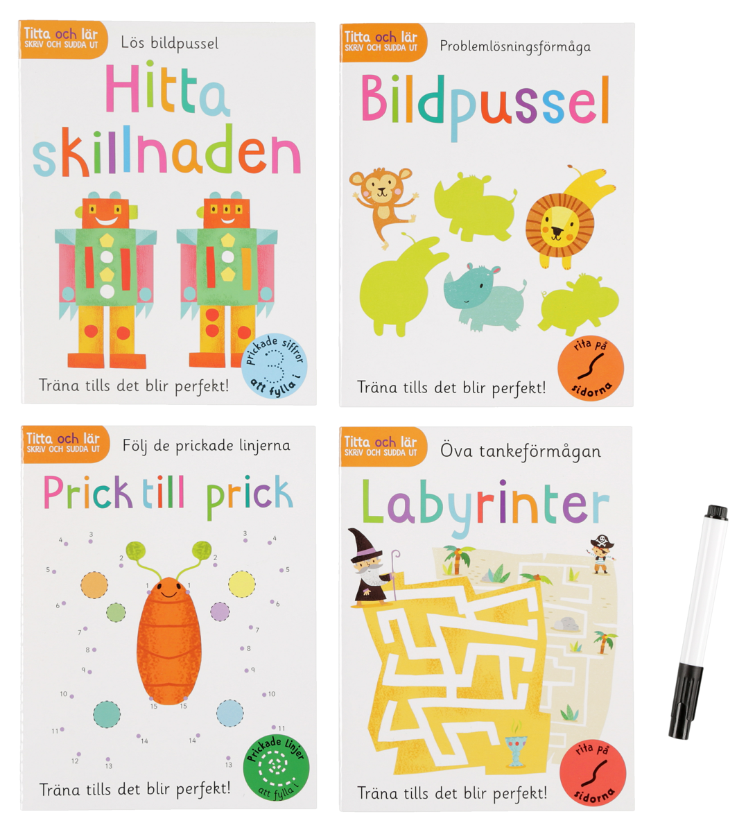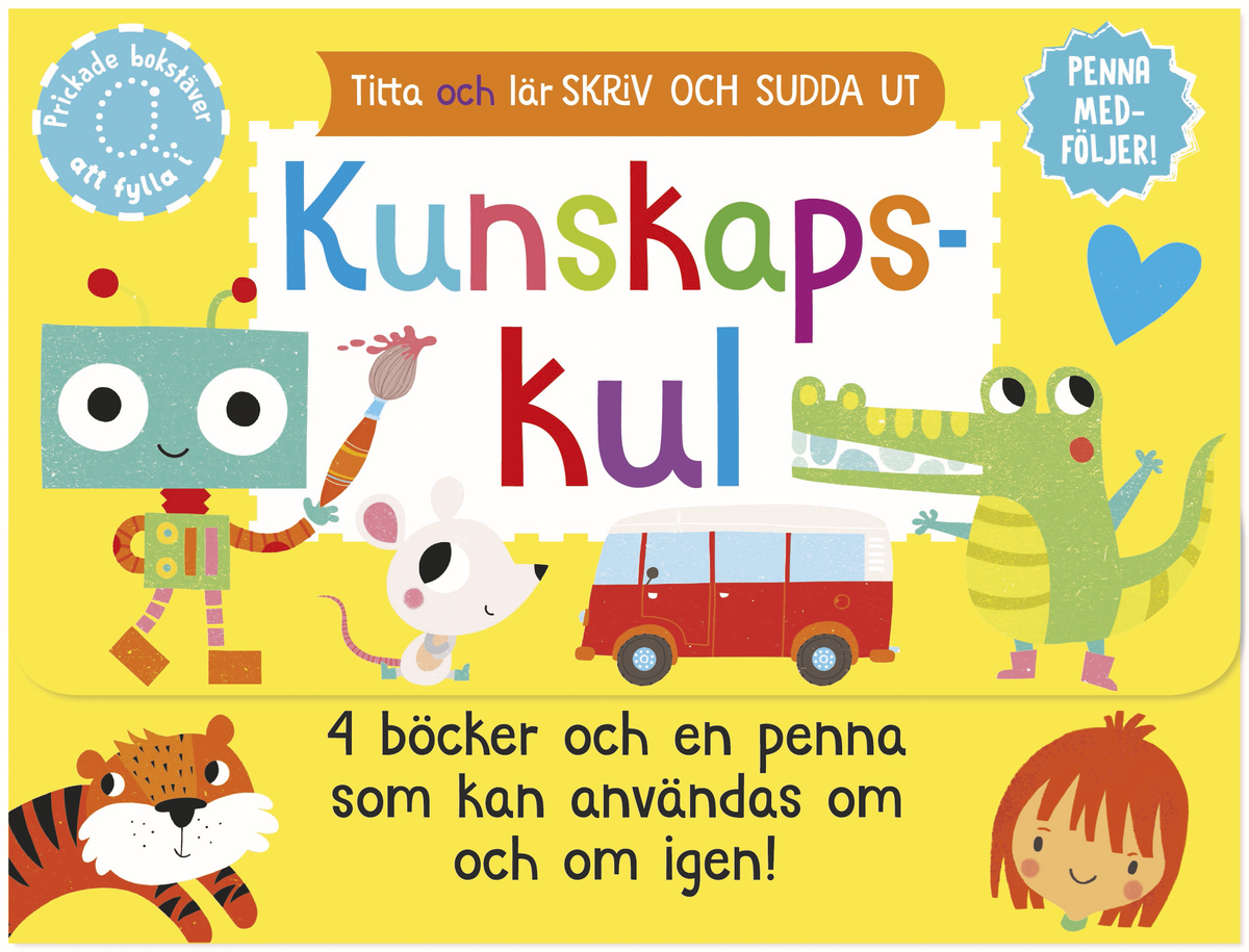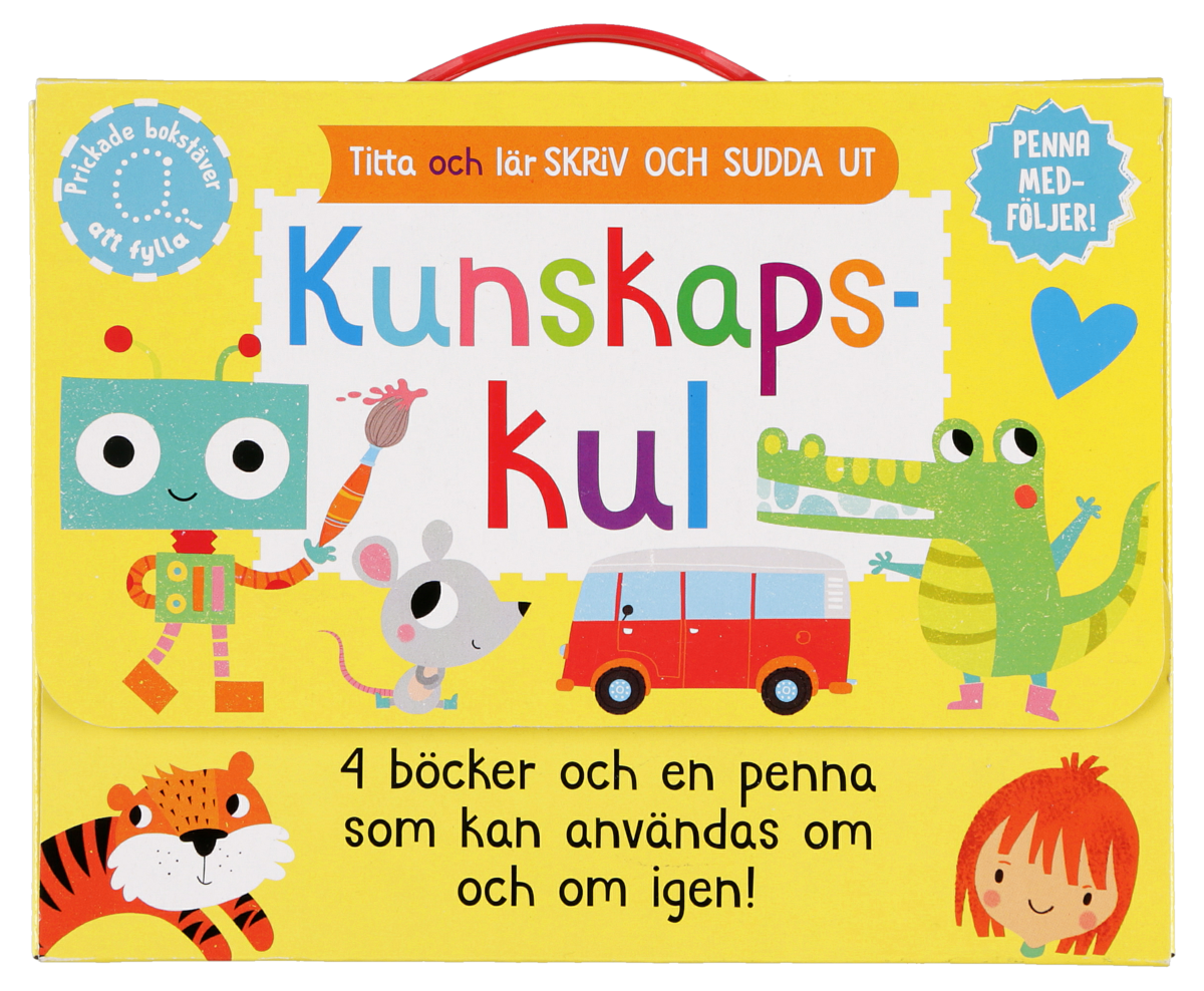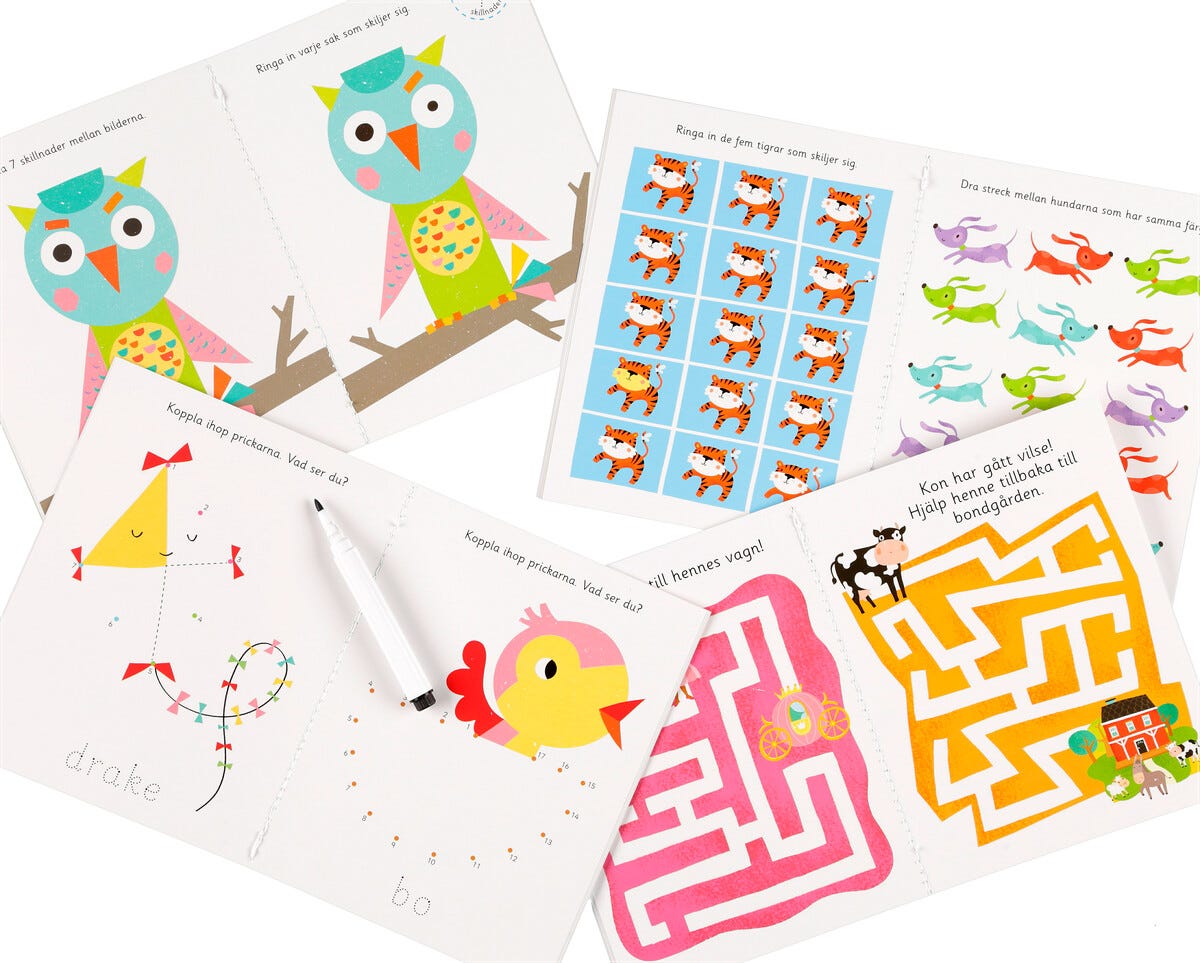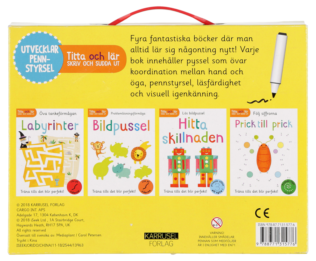 • Box med 4 pysselböcker och en penna som går att sudda.